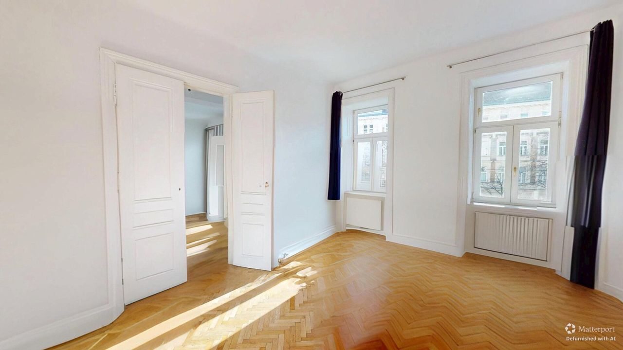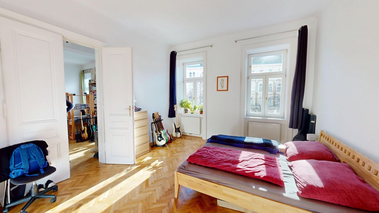 Das rund 20 m² große Schlafzimmer ist sowohl über das Badezimmer als auch über das Wohnzimmer zugänglich und überzeugt mit klassischem Wiener Fischgrätparkett, einer Raumhöhe von etwa 3,30 Metern und angenehmer Proportion. Die hohen Decken und großen Fenster unterstreichen den typischen Altbaucharakter.