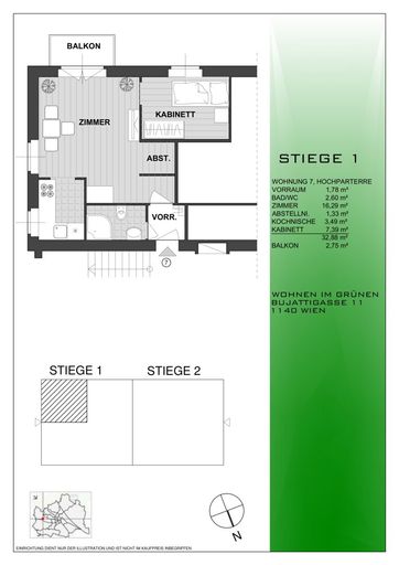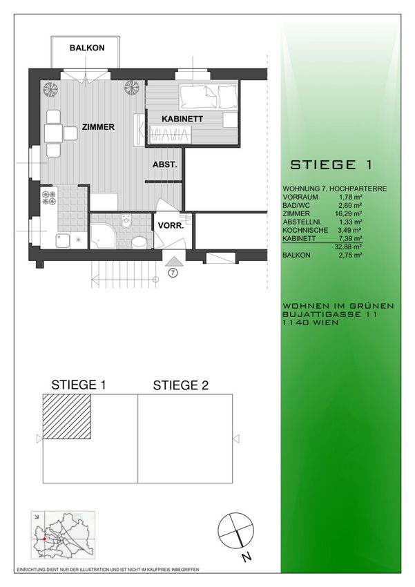 Die Wohnung befindet sich in der Bujattigasse, 1140 Wien, und bietet eine idyllische, ruhige Umgebung, einschließlich eines kleinen Baches und viel Grün direkt vor der Haustür.