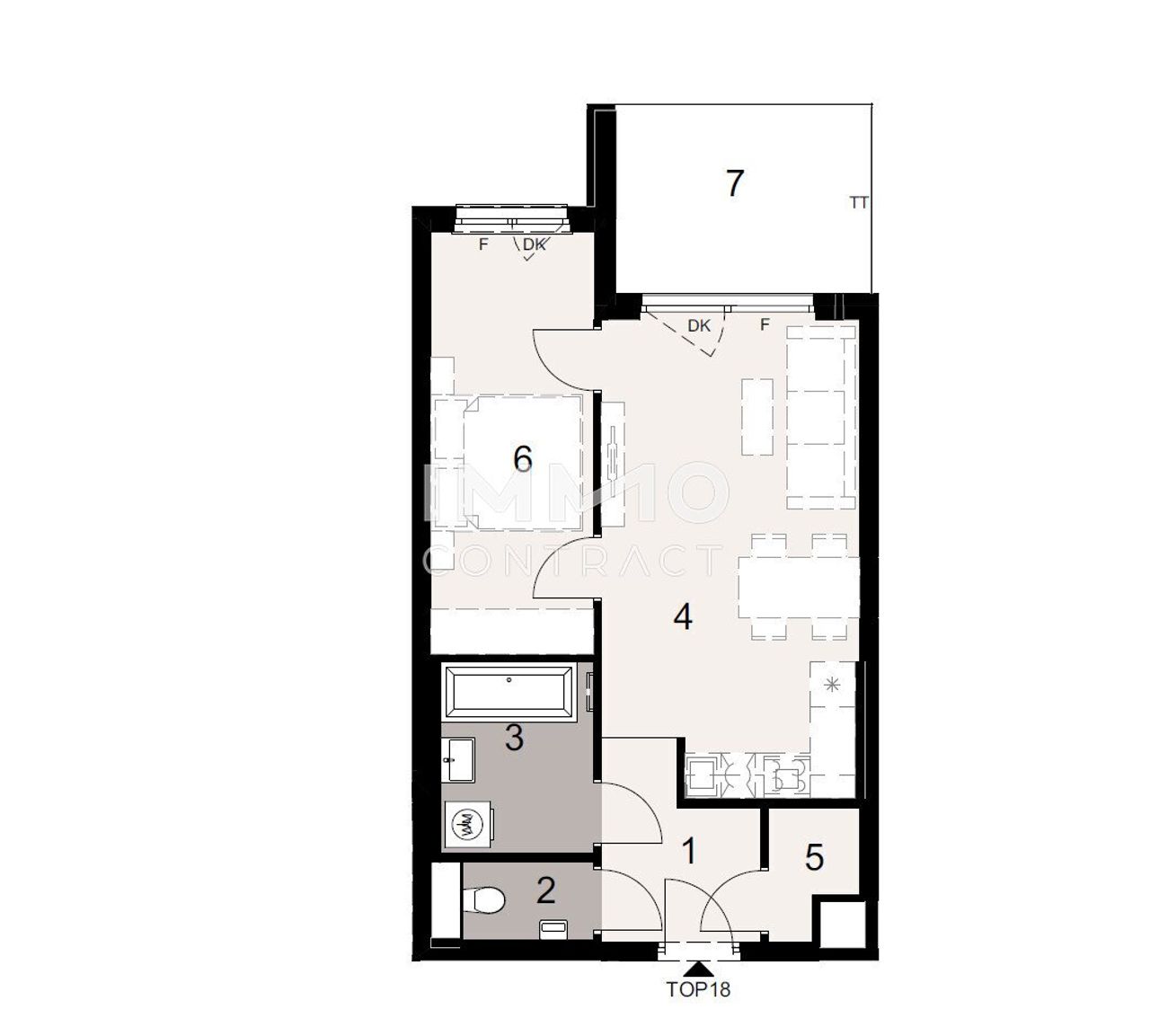 Der offene Wohnbereich überzeugt mit einem schönen, gut durchdachten Grundriss und schafft viel Raum für Ihre individuellen Wohnideen. Das Schlafzimmer bietet ausreichend Platz für ein großes Bett und einen Kleiderschrank.