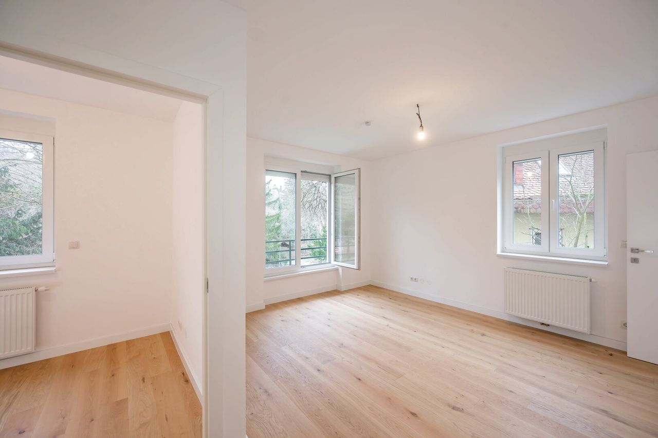 The apartment is located in Bujattigasse, 1140 Vienna, a tranquil and green area known for its idyllic surroundings, including a nearby stream and lush greenery.