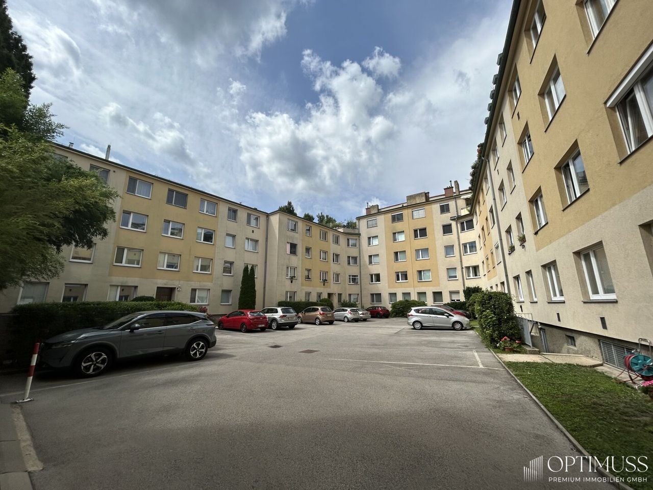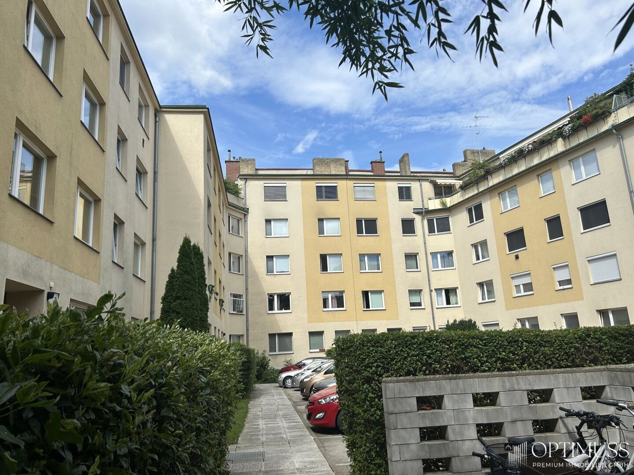 Ein großer Kellerabteil sorgt zusätzlich für Stauraum, während im Innenhof die Möglichkeit besteht, einen KFZ-Stellplatz anzumieten.
