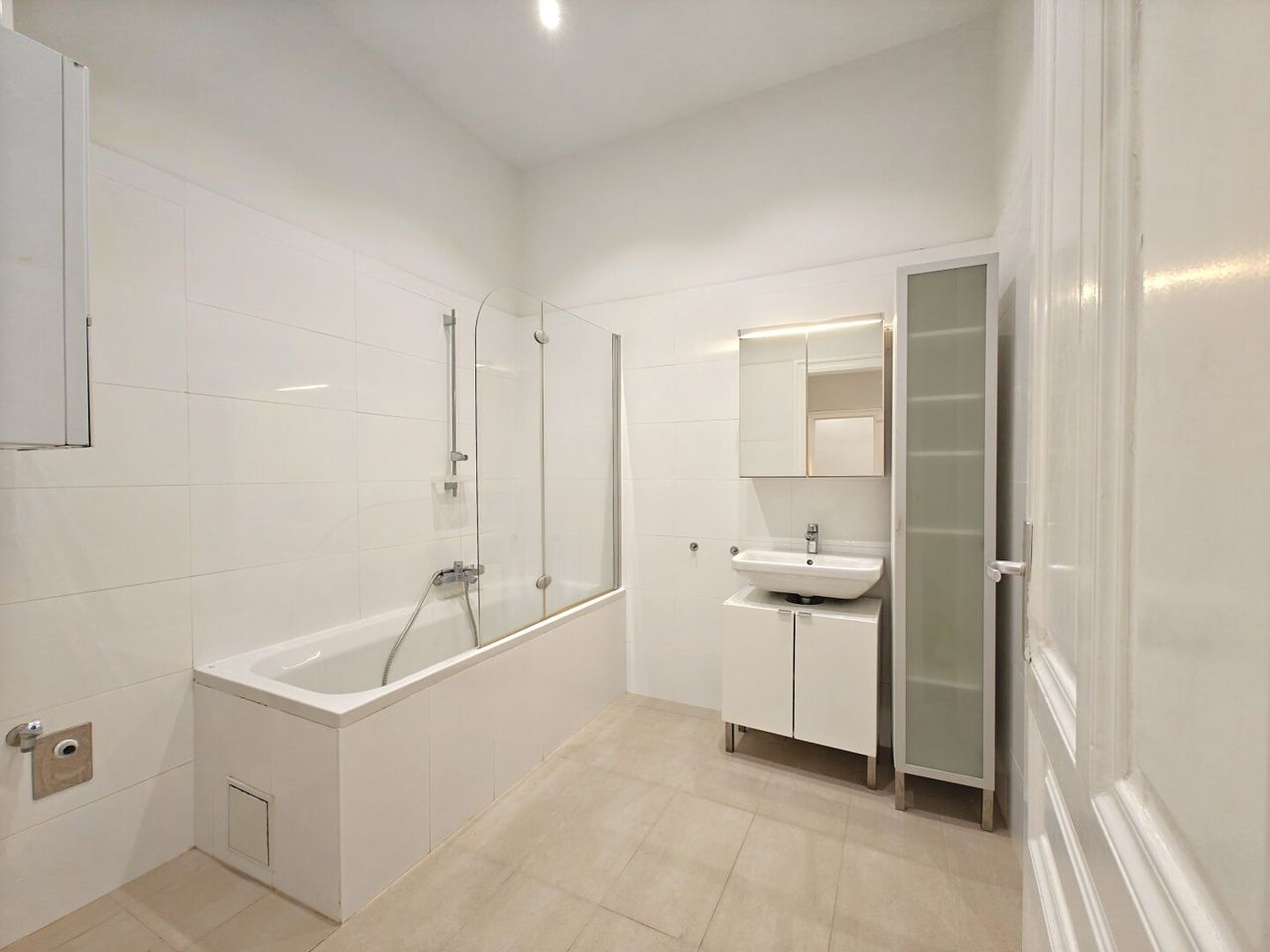 + Badezimmer mit Badewanne, Fenster zum Lichthof, Waschmaschinenanschluss, Waschtisch mit Unterschrank und Spiegelschrank