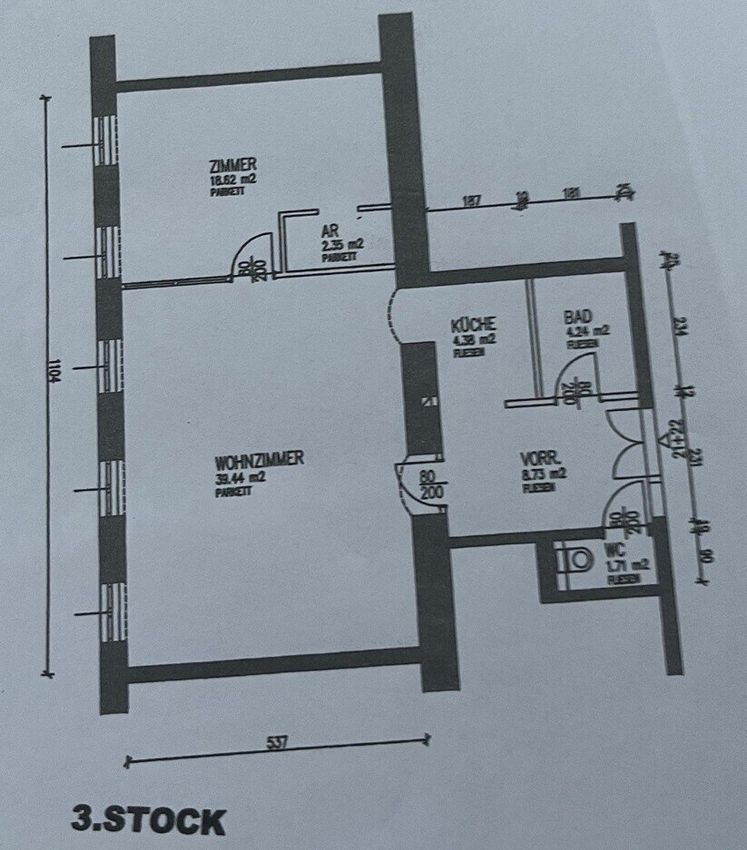 - 1x großes Wohn-/Esszimmer (ca. 39m²) (Einbau 3. Zimmer möglich)