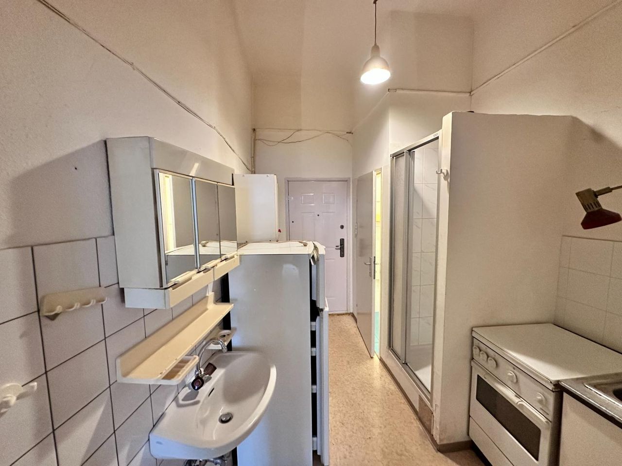 Der Vorraum fungiert zugleich als Eingangs-, Küchen- und Badbereich, von dem aus man direkt in die großzügige Wohnküche gelangt. Diese bildet das Herzstück der Wohnung – mit zwei Fenstern, die für viel Tageslicht sorgen. Von dort aus führt eine Tür in das separate Nebenzimmer, das sich ideal als Schlafzimmer, Homeoffice oder kreativer Rückzugsort eignet.