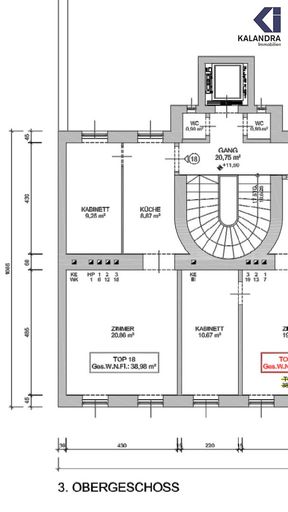 Vorraum, Wohnzimmer, Schlafkabinett, Küchenzeile im Wohnzimmer integriert, Duschbad mit WC, Abstellraum am Gang.