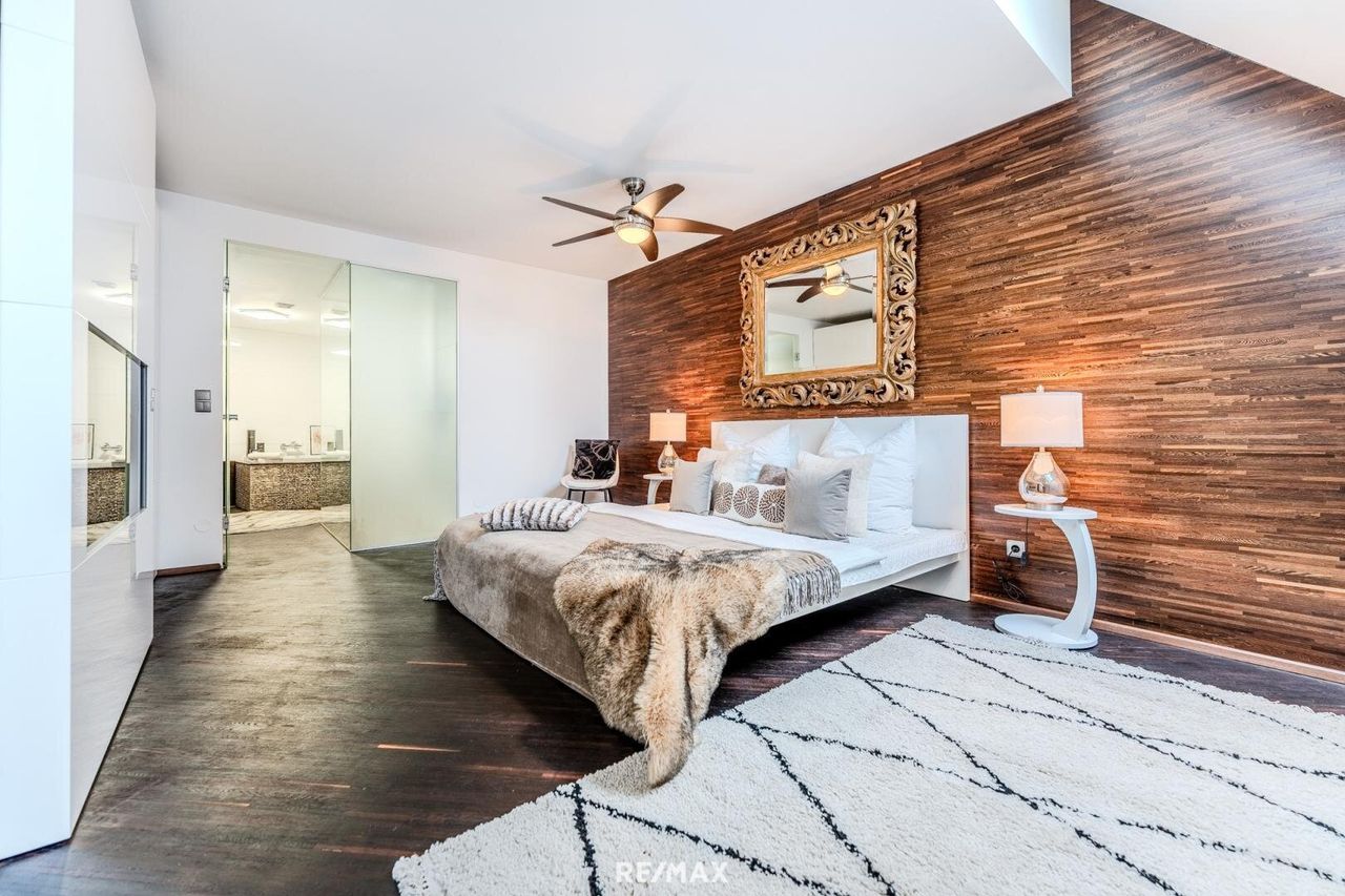 Das Highlight des Erdgeschosses ist der offene Wohnbereich mit vielen Gestaltungsmöglichkeiten in Verbindung zum Schlafbereich, getrennt durch einen Tischlereinbauschrank mit integriertem Fernseher. Dieser verbindet sich nahtlos mit einem luxuriösen Badezimmer, das keine Wünsche offenlässt: Badewanne, Walk-In Dusche und WC – alles eingefasst in edlen Fliesen und ergänzt durch Armaturen, die mit ihrer Qualität und Eleganz überzeugen.Ein großzügiges Zimmer (ca. 20 m²) mit eigenem Badezimmer und Walk-In Dusche eröffnet zahlreiche Nutzungsmöglichkeiten – ob als privater Gästebereich, Homeoffice oder Hobbyraum. Ein separat zugängliches WC mit Handwaschbecken sorgt für zusätzlichen Komfort.