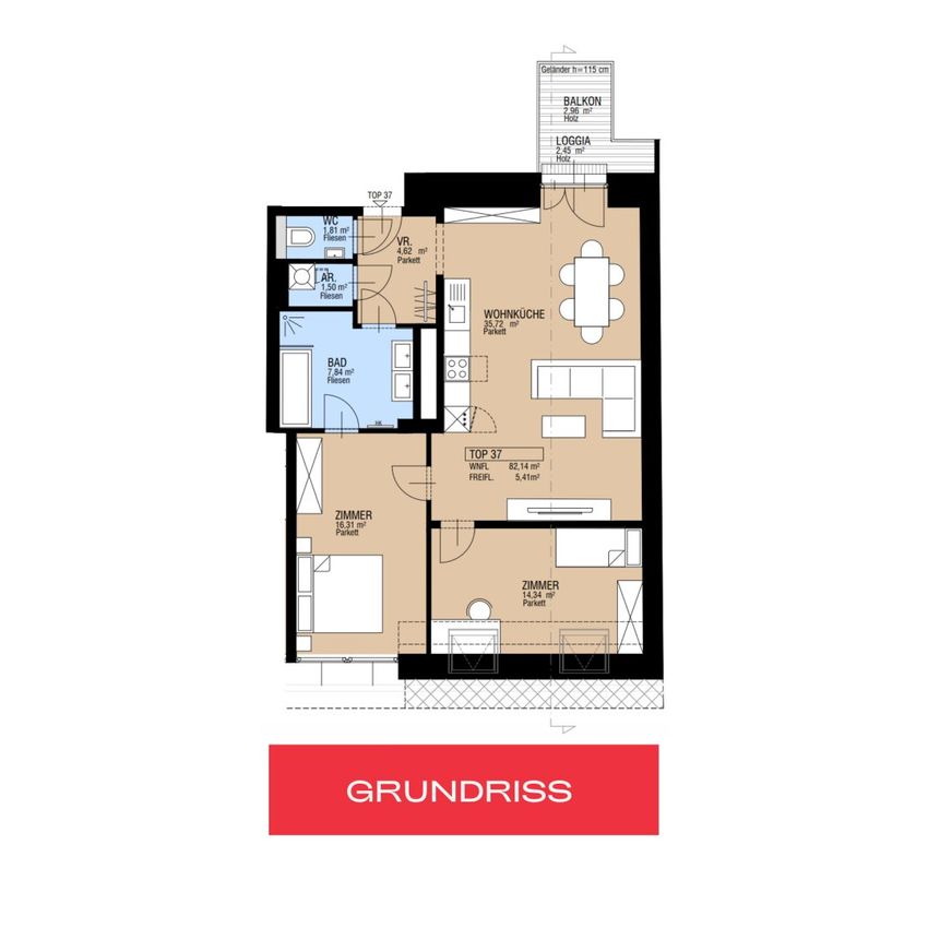 Die neu errichtete Wohnung Top 37 befindet sich im 1.Dachgeschoß des Hauses, barrierefrei vom Aufzug erreichbar. Sie zeichnet sich durch eine eine effiziente Raumaufteilung und Raumnutzung aus. Von der Wohnung aus genießt man den Blick über die vorgelagerte Fußgängerzone Meiselstraße, der hintere Teil der Wohnung verfügt über einen südseitig gelegenen, kombinierten Loggia-Balkon, dem ruhigen Innenhof zugewandt.