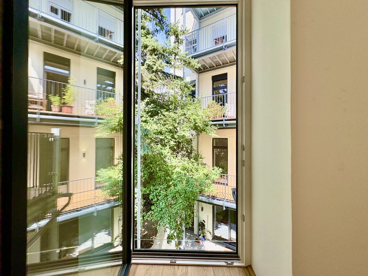 Neue Holzfenster in klassischer Altbau-Optik, 3-fach verglast. Eingangstüre 90x220 cm Sicherheitsklasse RC3 mit Sicherheitsbeschlägen, Innentüren 80x210 cm mit Langschildbeschlägen, jeweils in Altbau-Optik.