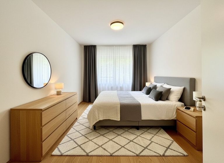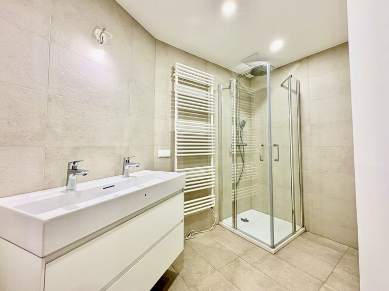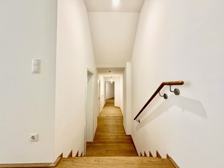 Die Wände sind weiß, mit Dispersion beschichtet. In den Wohnräumen wird neuer Langdielen Eichen-Parkett verlegt. Sanitärräume werden mit Feinsteinzeug italienischer Herstellung ausgelegt.