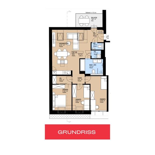 Durch den Vorraum betritt man offen die großzügige, gemeinsam mit dem Vorraumbereich etwa 38 m2 große Wohnküche, mit anschliessendem knapp 8 m2 großen, südseitig ausgerichtetem, hofseitigen Balkon. Durch eine Türe und einen kleinen Gangbereich erreicht man zentral die die drei straßenseitig (Fußgängerzone) gelegenen Schlafzimmer, eines davon mit extra Schrankraum, mit Flächen von 10-14 m2. Ein geräumiges, vom Wohnraum aus begehbares Badezimmer mit Wanne, Dusche und WC, sowie ein extra Gäste-WC und ein Abstellraum komplettieren das Angebot dieser exklusiven Wohnung.