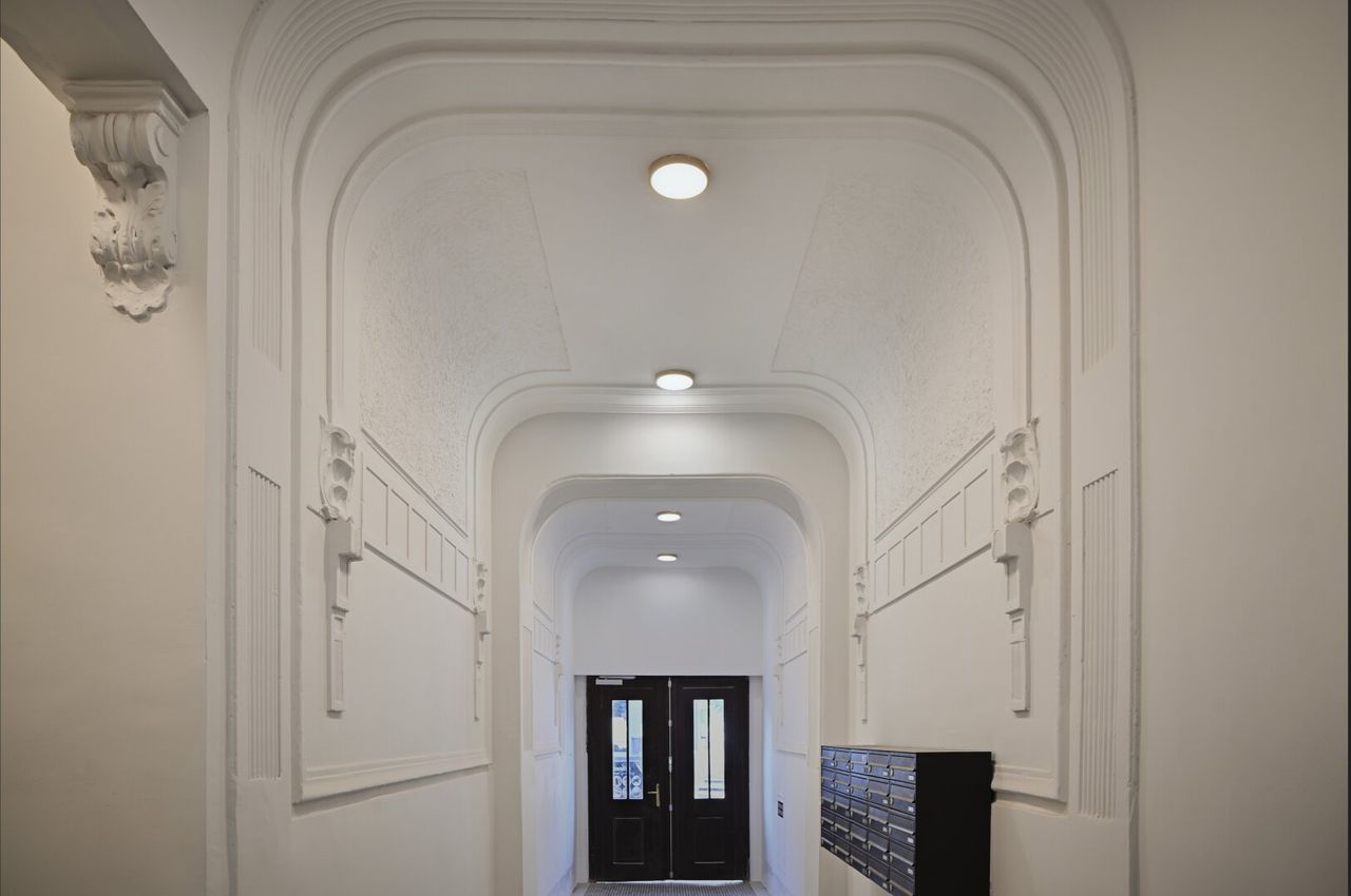 Die Wände sind weiß, mit Dispersion beschichtet. In den Wohnräumen wird neuer, hochwertiger Dielenboden verlegt. Sanitärräume werden mit Feinsteinzeug italienischer Herstellung ausgelegt.