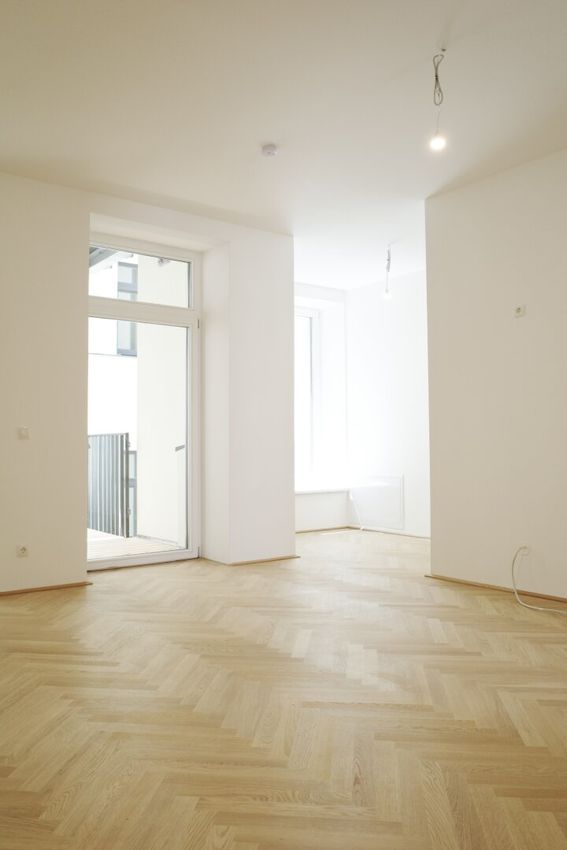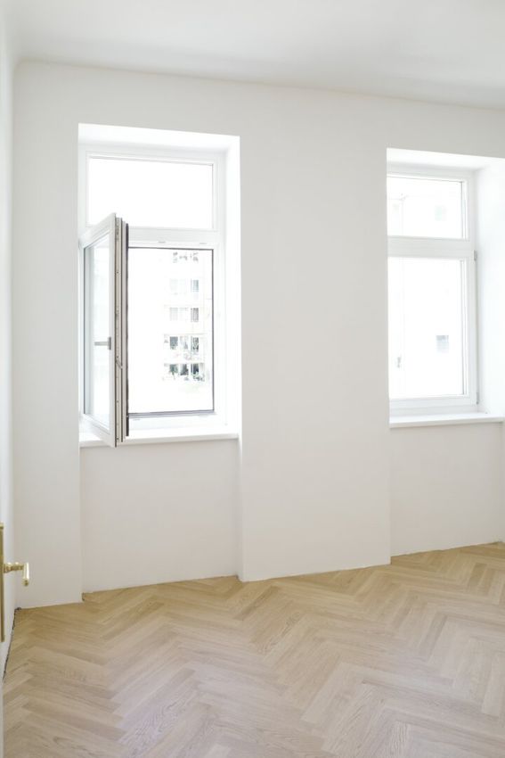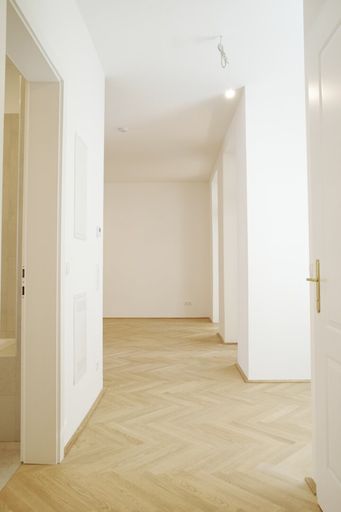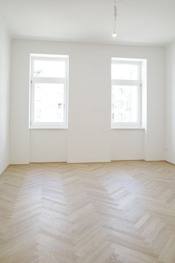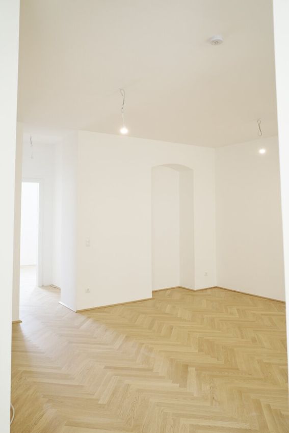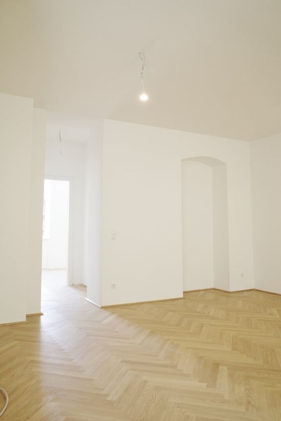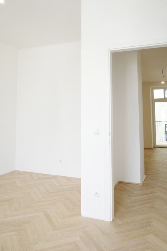 Die Wände sind weiß, mit Dispersion beschichtet. In den Wohnräumen wird neuer Altwiener Eichen-Fischgrät-Parkett verlegt. Sanitärräume werden mit Feinsteinzeug italienischer Herstellung ausgelegt.