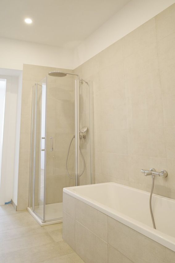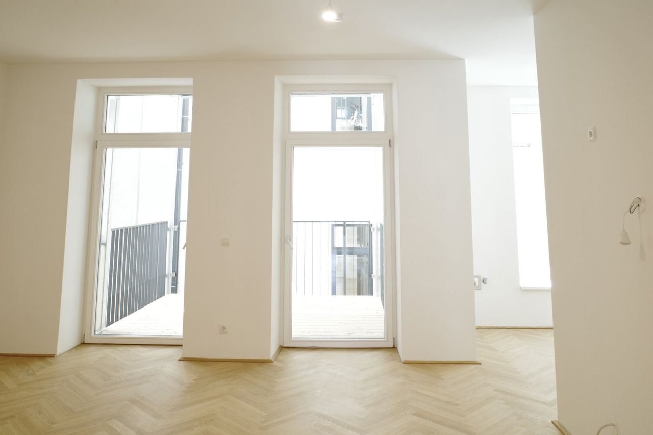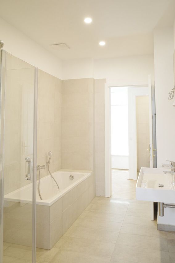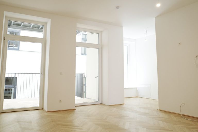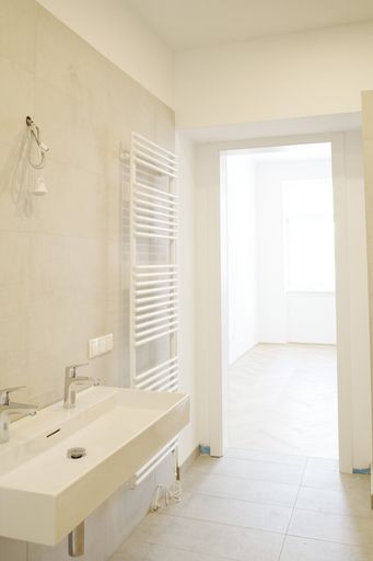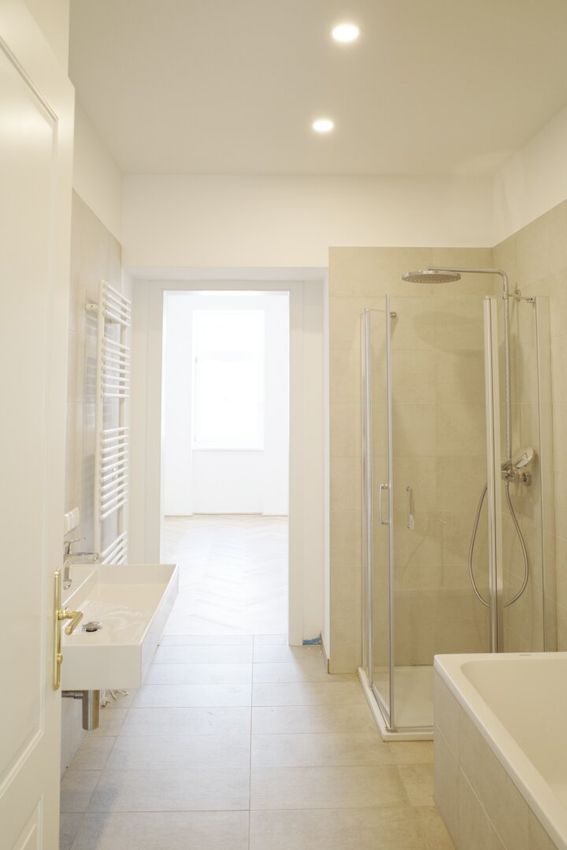 Die Wände sind weiß, mit Dispersion beschichtet. In den Wohnräumen wird neuer Altwiener Eichen-Fischgrät-Parkett verlegt. Sanitärräume werden mit Feinsteinzeug italienischer Herstellung ausgelegt.