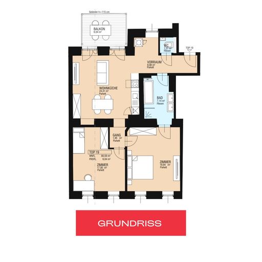 Die insgesamt 21 Wohnungen mit Wohnflächen von 40 bis 126m² sind mit Freiflächen ausgestattet (Loggia, Terrasse oder Garten) und bieten einen hohen Ausstattungsstandard.