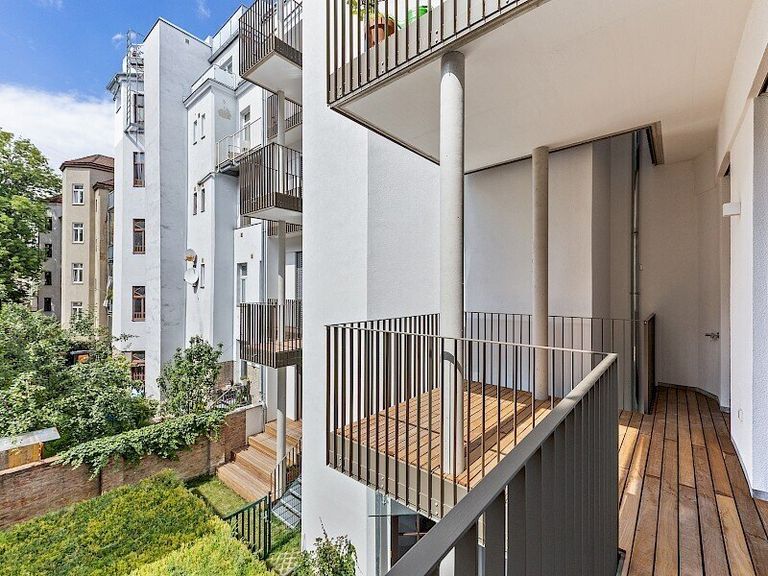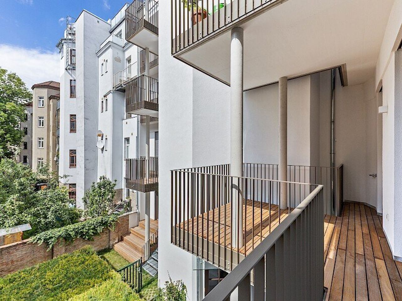 In einem generalsanierten Spätsecessionshaus (BJ 1913–1914) entstehen 22 hochwertige Wohnungen mit Größen von 37 bis 150 m², teilweise mit Balkon, Terrasse oder Garten.