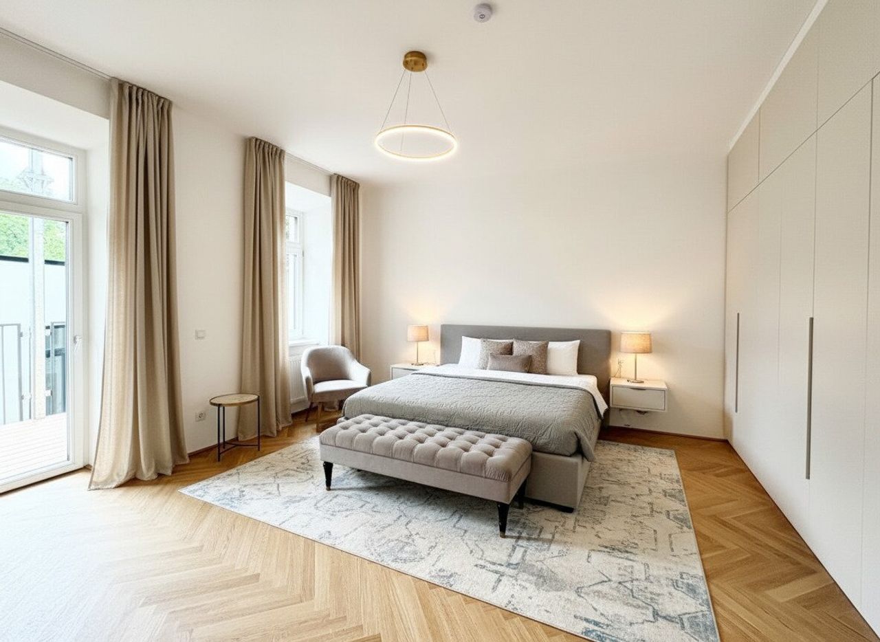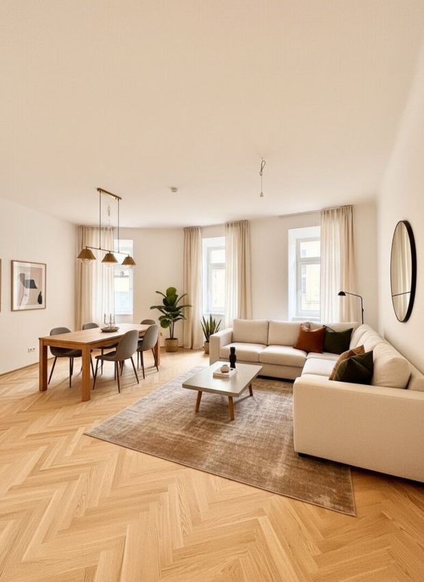 Die Wände sind weiß, mit Dispersion beschichtet. In den Wohnräumen wird neuer Altwiener Eichen-Fischgrät-Parkett verlegt. Sanitärräume werden mit Feinsteinzeug italienischer Herstellung ausgelegt.