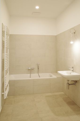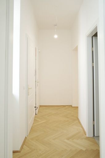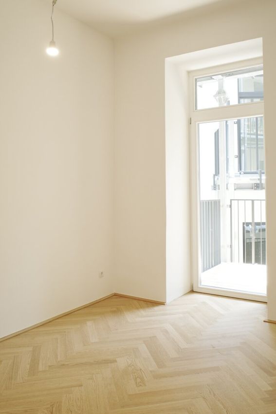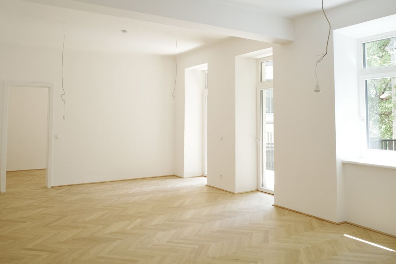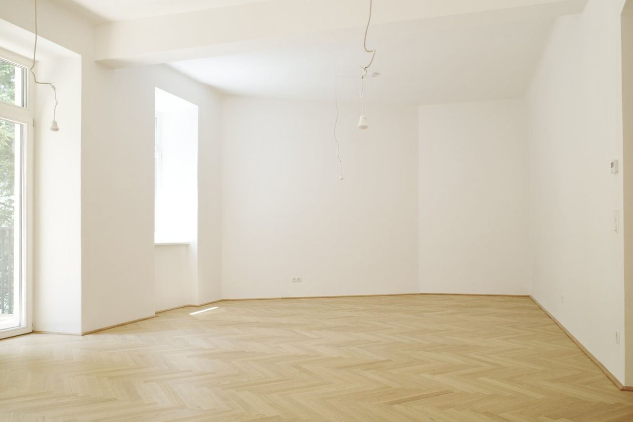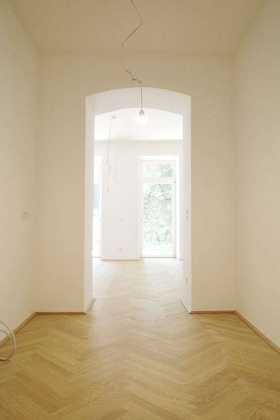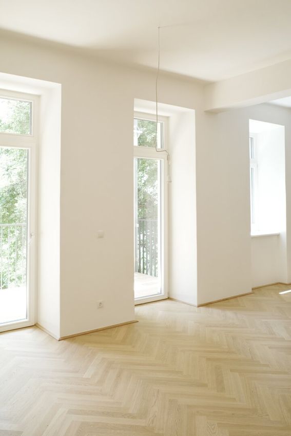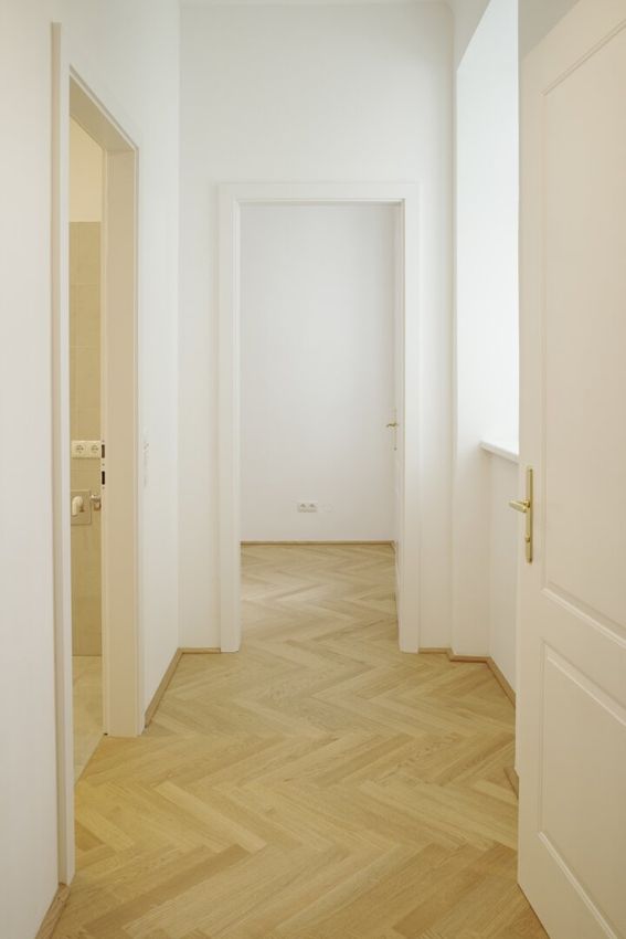 Die Wände sind weiß, mit Dispersion beschichtet. In den Wohnräumen wird neuer Altwiener Eichen-Fischgrät-Parkett verlegt. Sanitärräume werden mit Feinsteinzeug italienischer Herstellung ausgelegt.