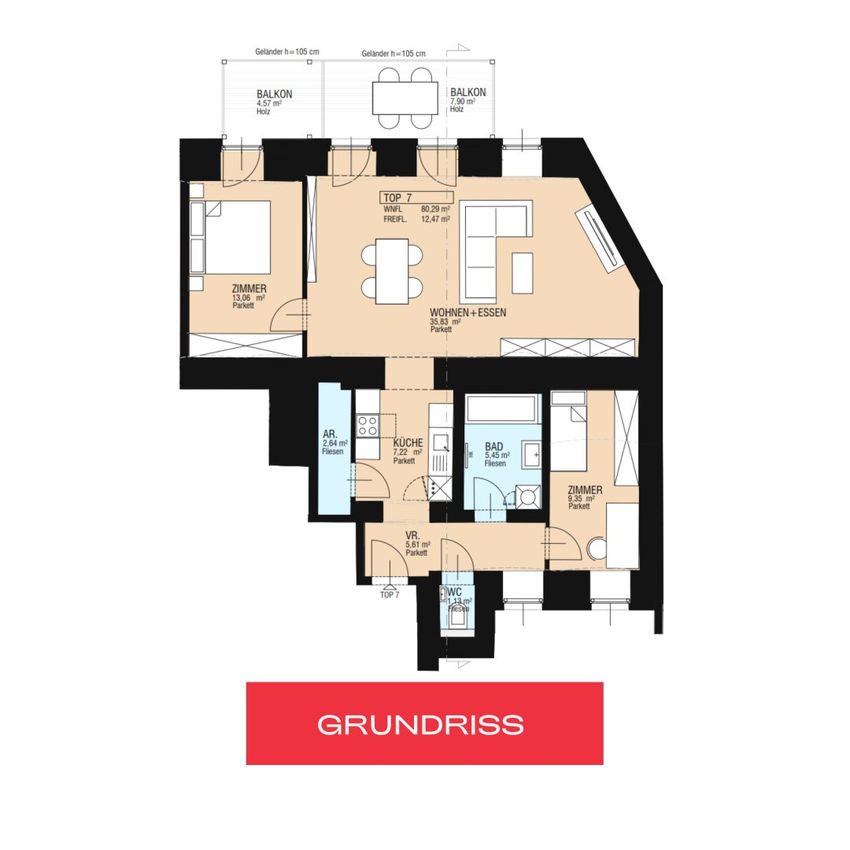 Die Wohnung Top 7 befindet sich im Hochparterre des Hauses im ruhigen, hofseitigen Trakt des Gebäudes. Sie zeichnet sich durch eine Raumhöhe von 3 Metern und einer effizienten Raumnutzung aus. Ergänzt wird diese Wohnung durch einen extragroßen, südseitig ausgerichteten Balkon in den Innenhof der zum Verweilen einlädt.