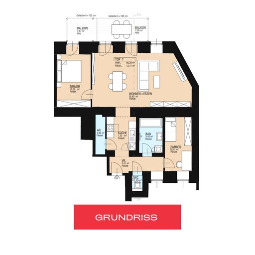 Durch den Vorraum betritt das erste Schlafzimmer, das Bad mit Wanne sowie die Küche. Durch diese erreicht man das geräumige, 36 m2 große Wohn-/Esszimmer sowie den vorgelagerten, über 12m2 großen Balkon. Vom Wohnzimmer aus betritt man auch das zweite Schlafzimmer welches ebenfalls Zugang zum großen Balkon hat. Ein der Küche zugeordneter Abstellraum komplettiert das Angebot dieser exklusiven Wohnung.