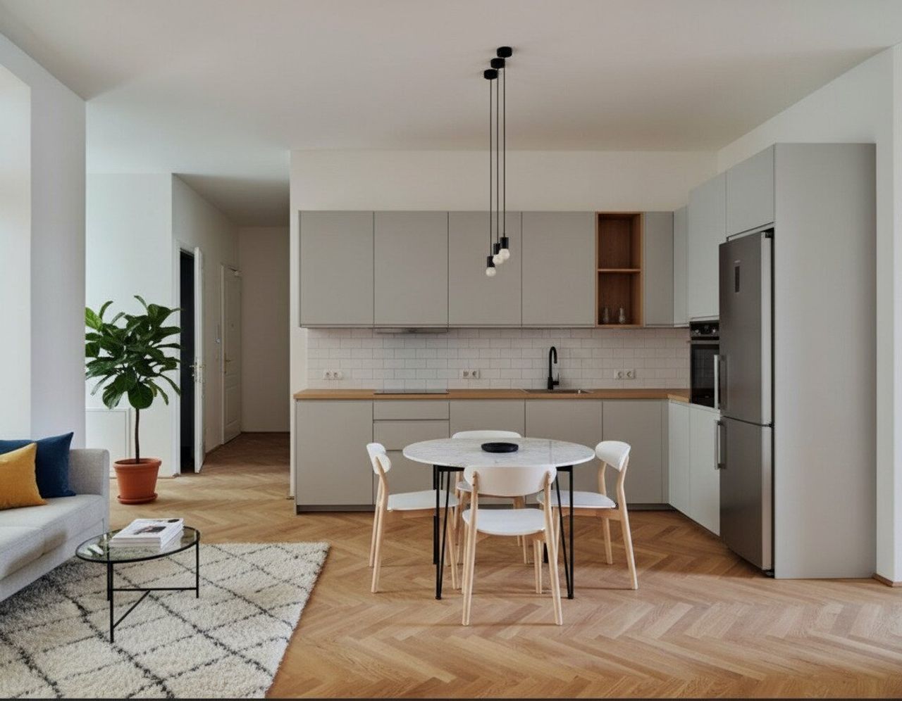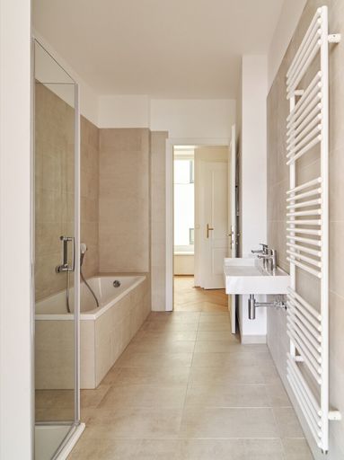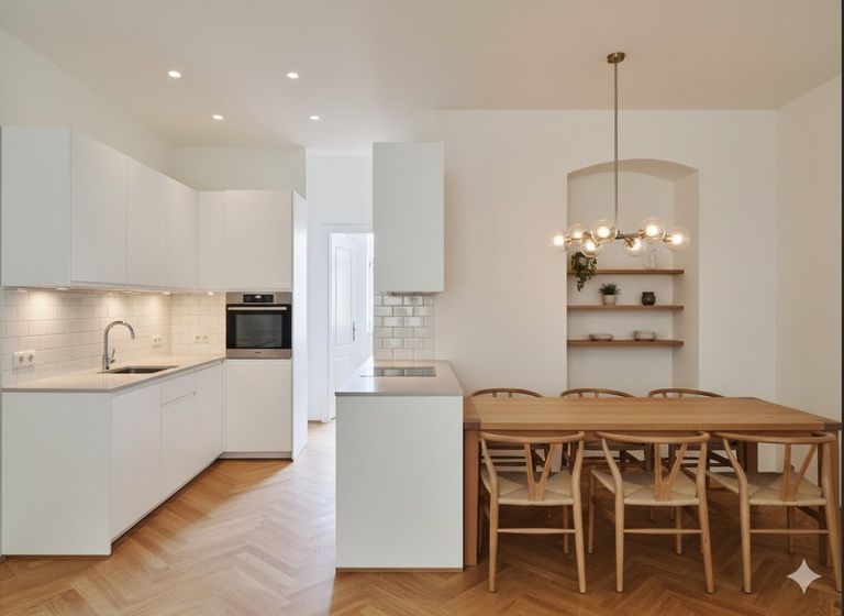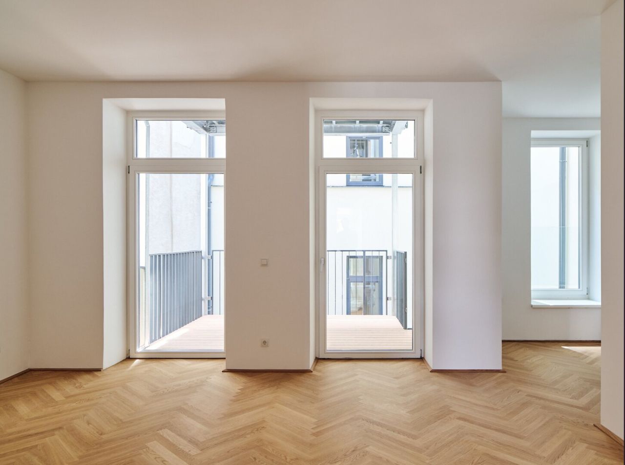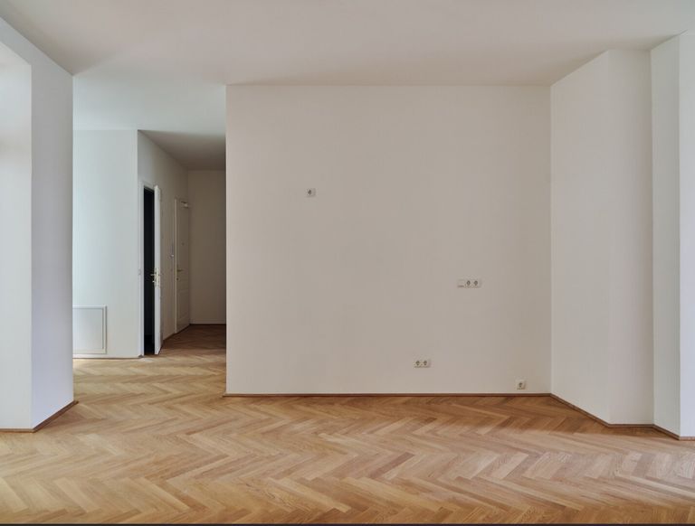 Die Wände sind weiß, mit Dispersion beschichtet. In den Wohnräumen wird neuer Altwiener Eichen-Fischgrät-Parkett verlegt. Sanitärräume werden mit Feinsteinzeug italienischer Herstellung ausgelegt.