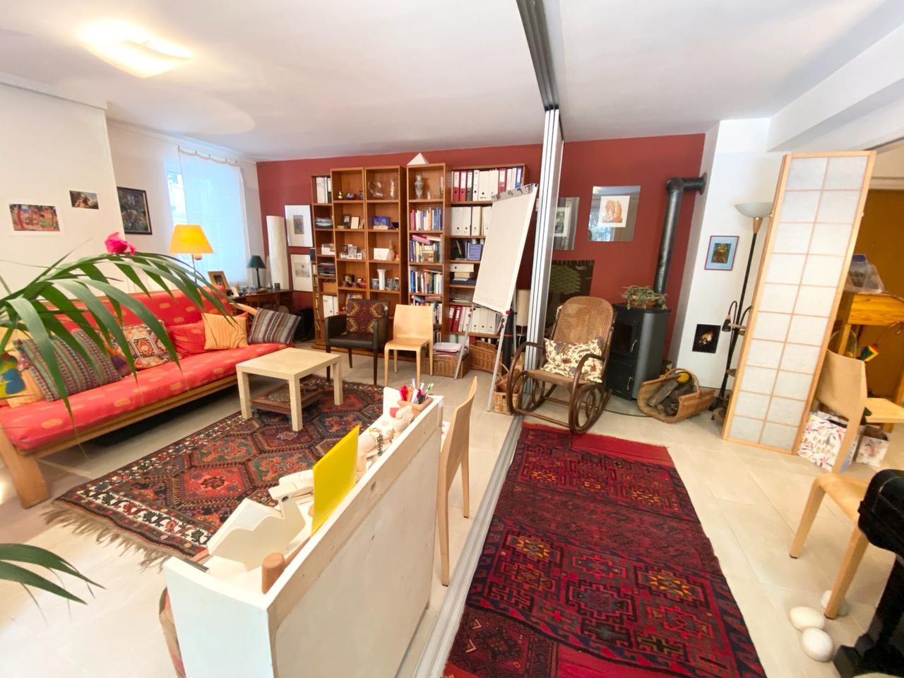 Ein Schwedenofen sorgt im Wohnbereich für zusätzliche Behaglichkeit, während die hochwertige Verglasung ganzjährig für ein angenehmes Raumklima sorgt. Dank einer integrierten Schiebewand lässt sich der Wohnbereich flexibel zonieren – etwa für Homeoffice, Atelier, Studio oder Wohnzimmer.