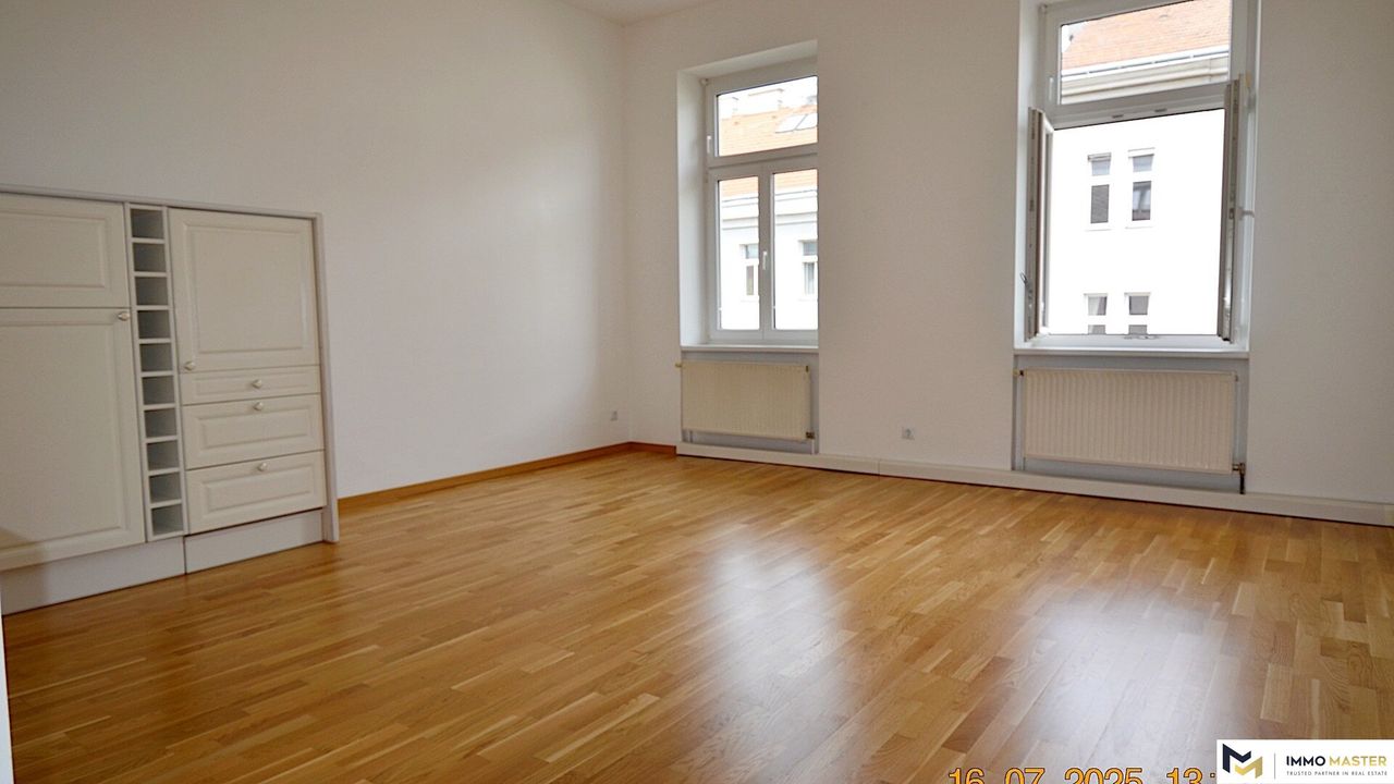 Mitten im metaphorischen „Bermuda-Dreieck“ – gebildet von der Lugner City, der U6-Station Burggasse/Stadthalle und der international bekannten Stadthalle mit ihrem bunten Programmreigen – liegt im 3. Liftstock eine 82 m² große Wohlfühlwohnung, die hält, was sie verspricht: urbanes Leben mit Komfort und Charme.