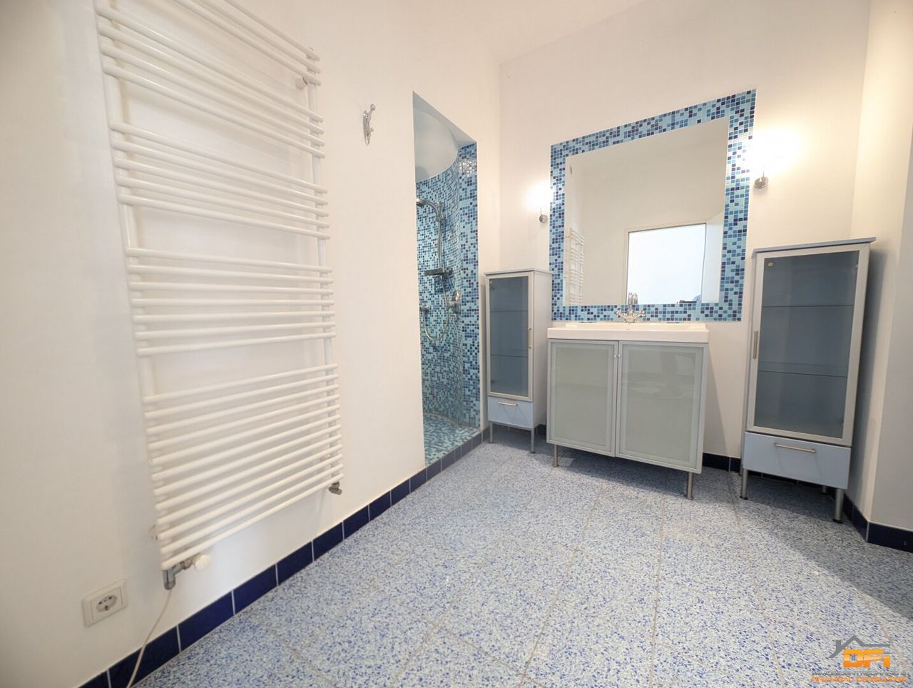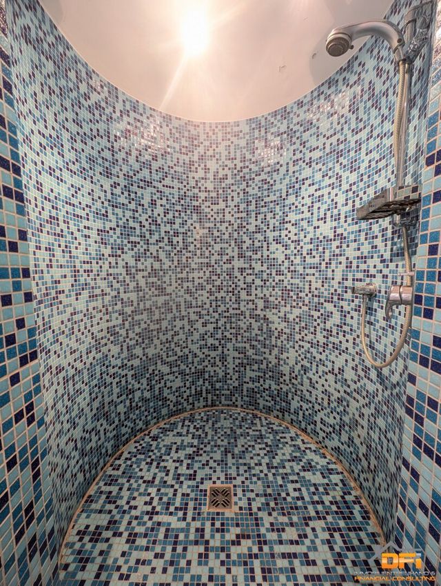 Bad mit Dusche und Waschmaschinenanschluss: Das Badezimmer ist modern verfliest und verfügt über eine sehr geräumige Dusche.