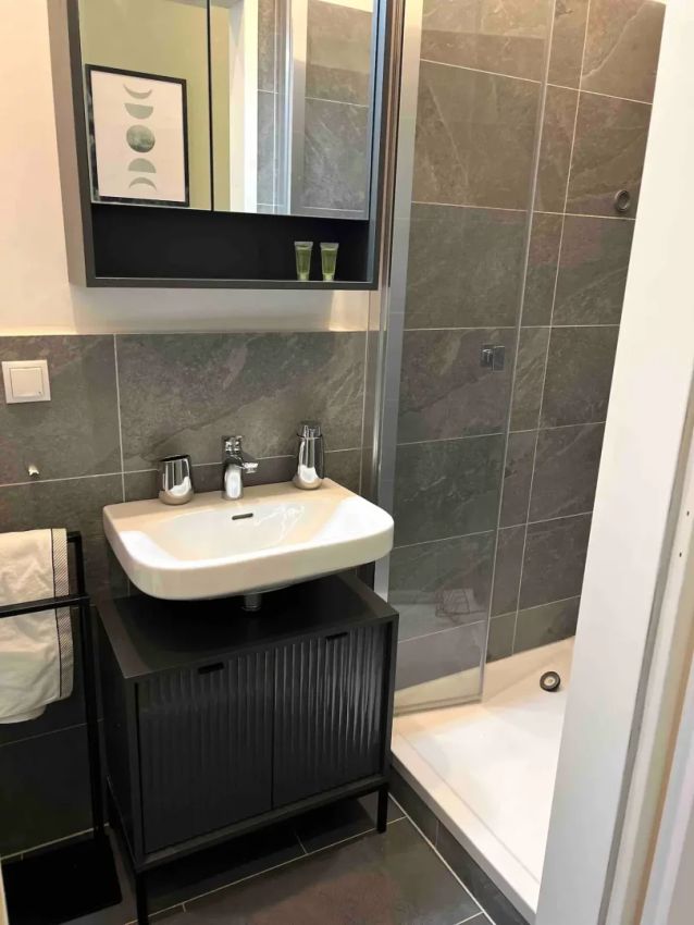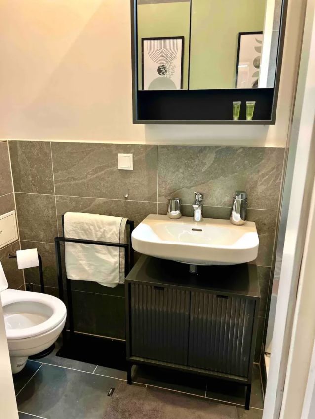 Im Wohnraum wurde die Wohnung mit Laminat ausgestattet. Das Badezimmer wurde mit großflächigen Feinsteinzeug ausgestattet.