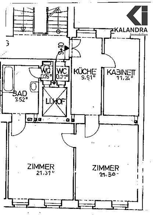 Vorraum mit integrierter Küchenzeile, zwei strassenseitige Zimmer (Durchgangszimmer - siehe Planskizze), ein separat zugängliches, hofseitiges Kabinett / Kinderzimmer, Wannenbad mit WC.