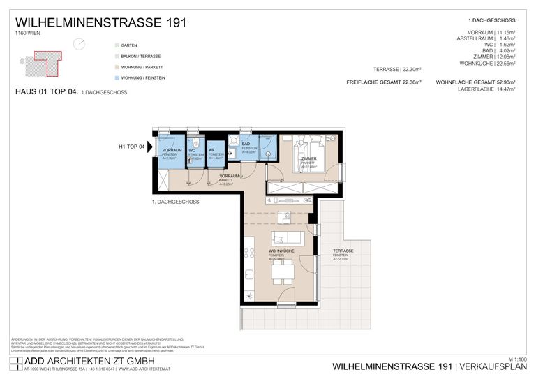 - 1 über 22 m² große Eckterrasse mit Blick über Wien