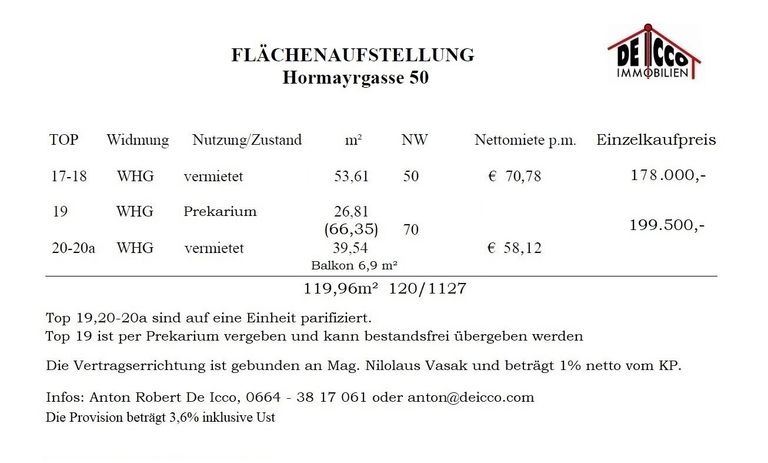 Zum Verkauf stehen hier 2 teilweise vermietete Einheiten im 2.Stock eines komplett sanierten Altbaus mit bereits erfolgtem Dachausbau und Lift in der Hormayrgasse 50.