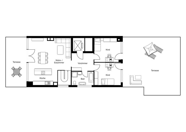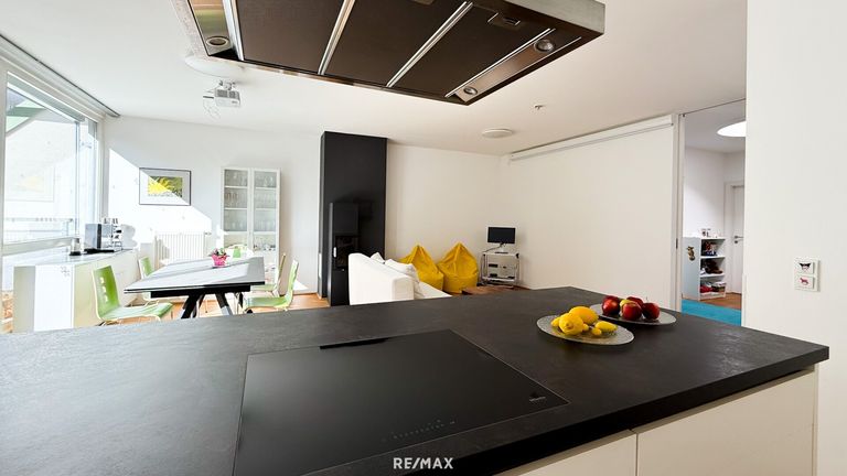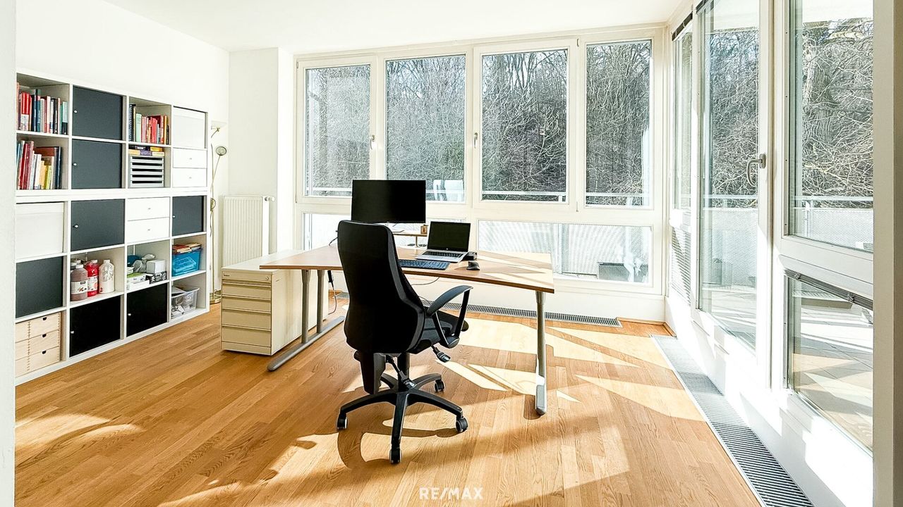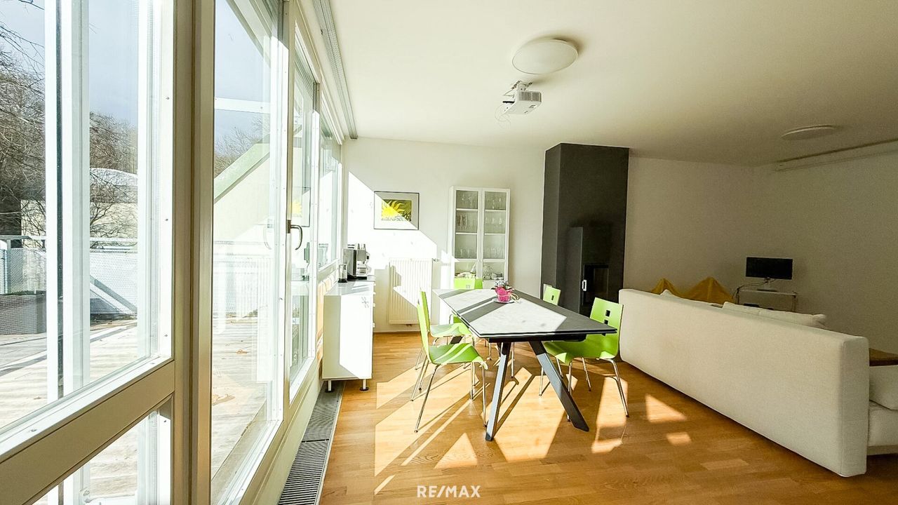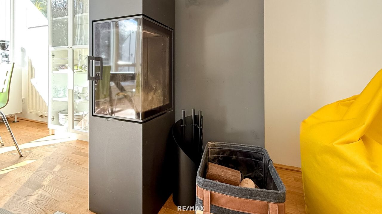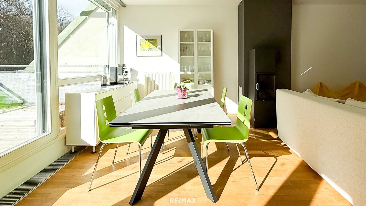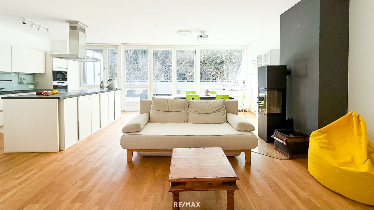 Der durchdachte Grundriss schafft ein harmonisches Zusammenspiel aus Offenheit und Privatsphäre. Der großzügige Wohn- und Essbereich mit Kamin bildet das Herzstück der Wohnung – ein Ort für gemeinsame Familienmomente und stilvolle Abende mit Freunden. Große Fensterflächen mit Beschattungsmöglichkeit sorgen für ein lichtdurchflutetes Ambiente und eröffnen einen herrlichen Grünblick.