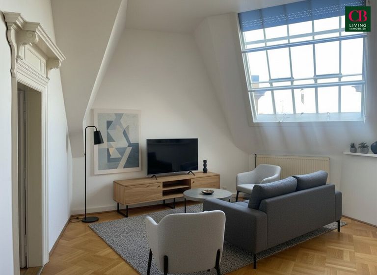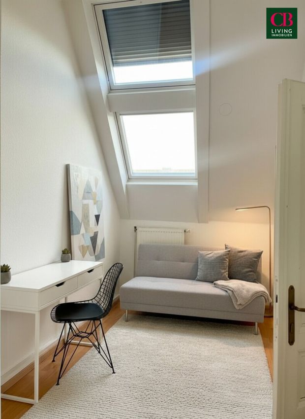Der Dachgeschosscharakter verleiht der Wohnung eine besondere Atmosphäre, während der französische Flair und die großzügigen Fensterflächen einen eleganten und freundlichen Eindruck hinterlassen.