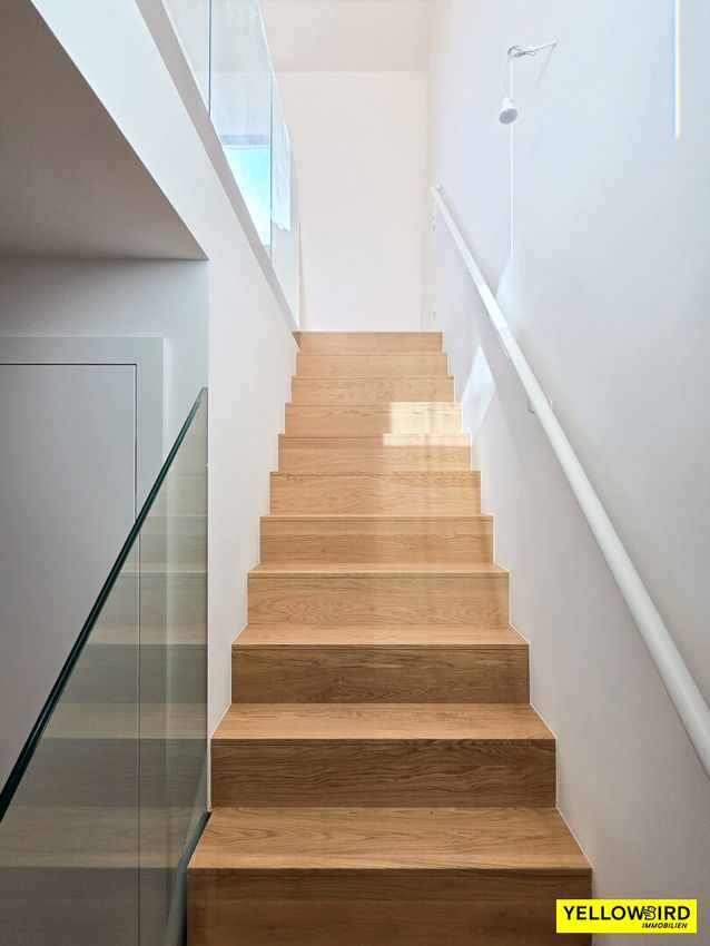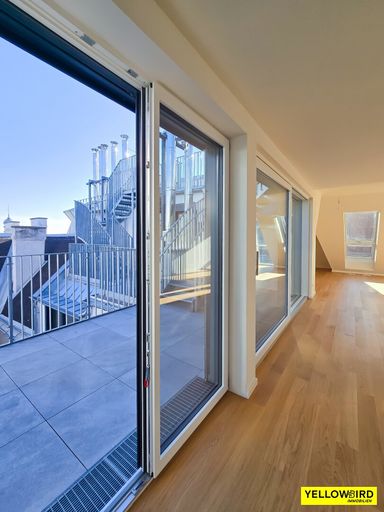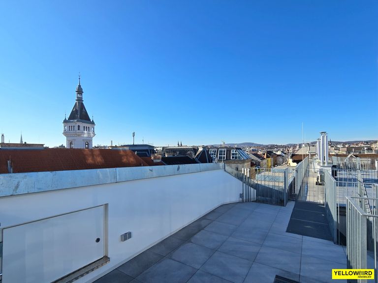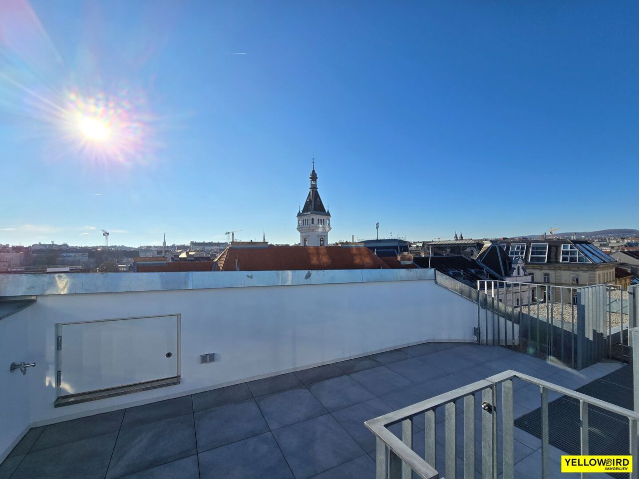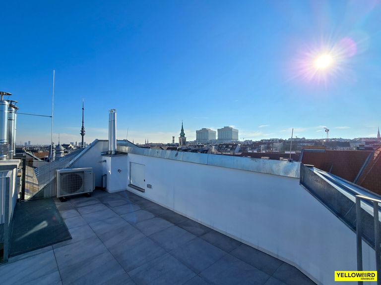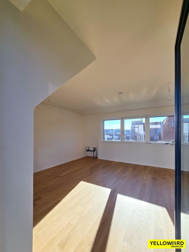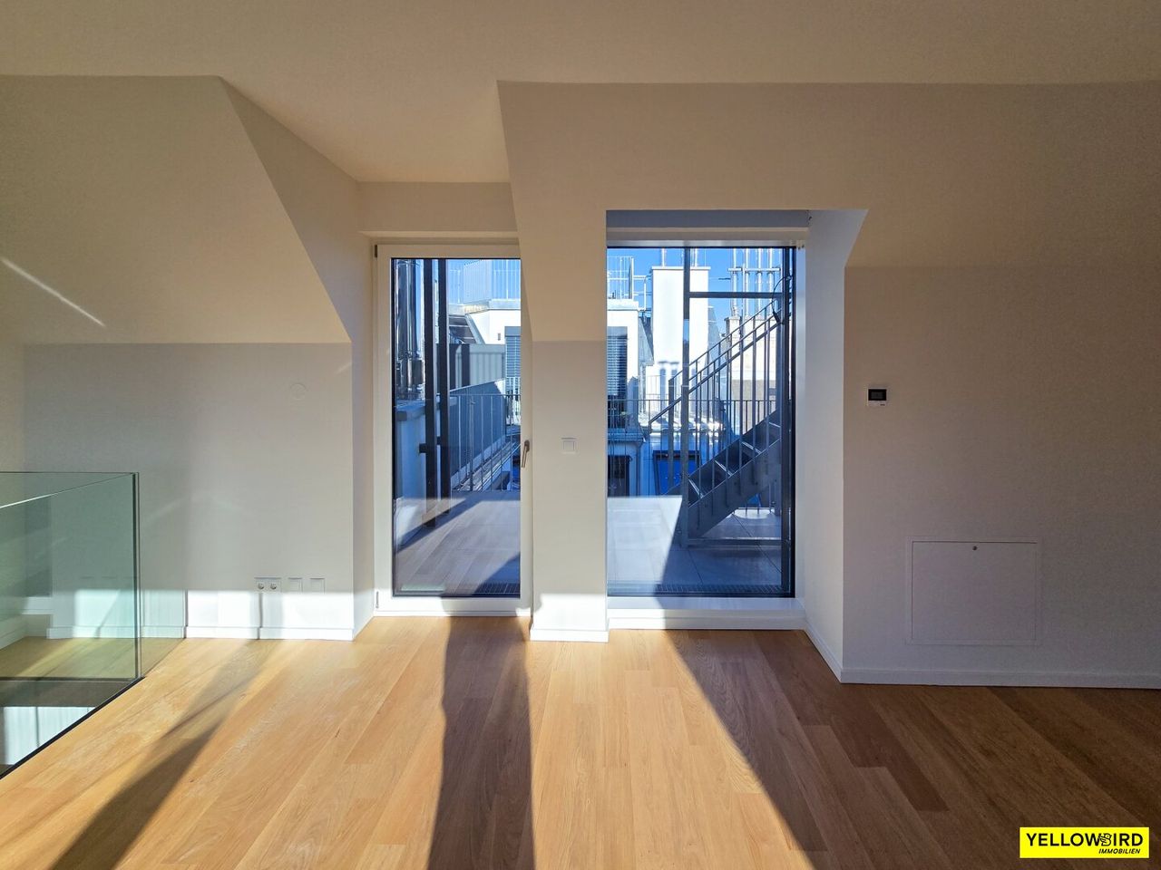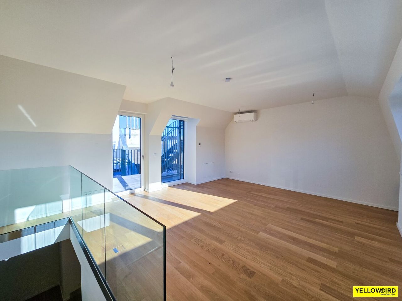 Luftwärmepumpe, Fußbodenheizung und Klimaanlage sorgen ganzjährig für modernen Wohnkomfort, ergänzt durch eine großzügige Dachterrasse mit Blick über ganz Wien.