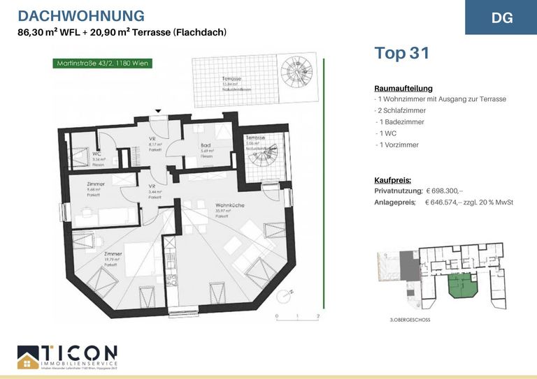 TOP C31 (1.DG): Diese gut aufgeteilte 3 Zimmerwohnung mit 86,30 m² plus 5,06 m² Terrasse befindet sich im 1.Dachgeschoss (ausgerichtet in den Innenhof ).