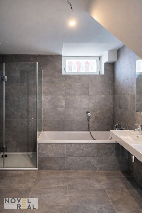 Hochwertig ausgestattet mit Badewanne, Doppelwaschtisch und stilvollen Fliesen. Großzügig und komfortabel – ideal für den täglichen Wellnessmoment.