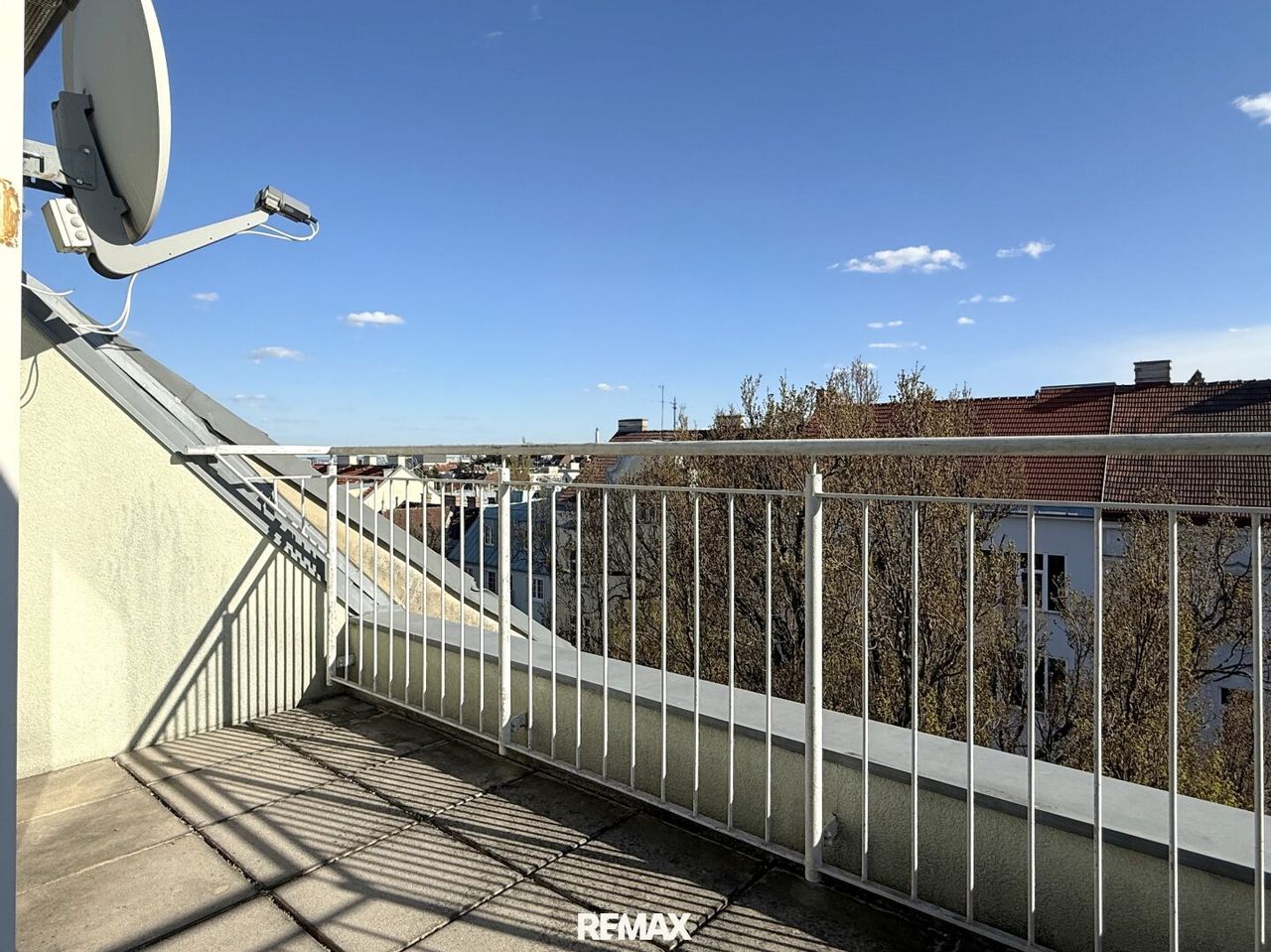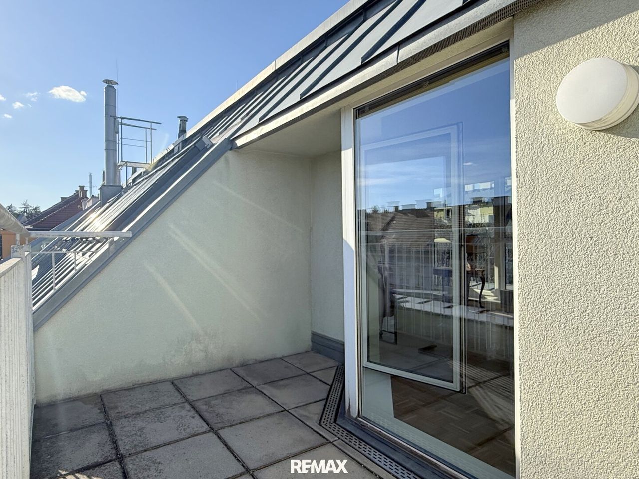 Mit wenigen Schritten geht’s auf die Terrasse, nicht überdimensioniert, sondern genau so, wie man sie wirklich nutzt. Mit einem Blick, der weiter als weit geht. Über Dächer, über die Stadt – bis hin zum Prater. Kein Spektakel, sondern ein stiller Luxus.