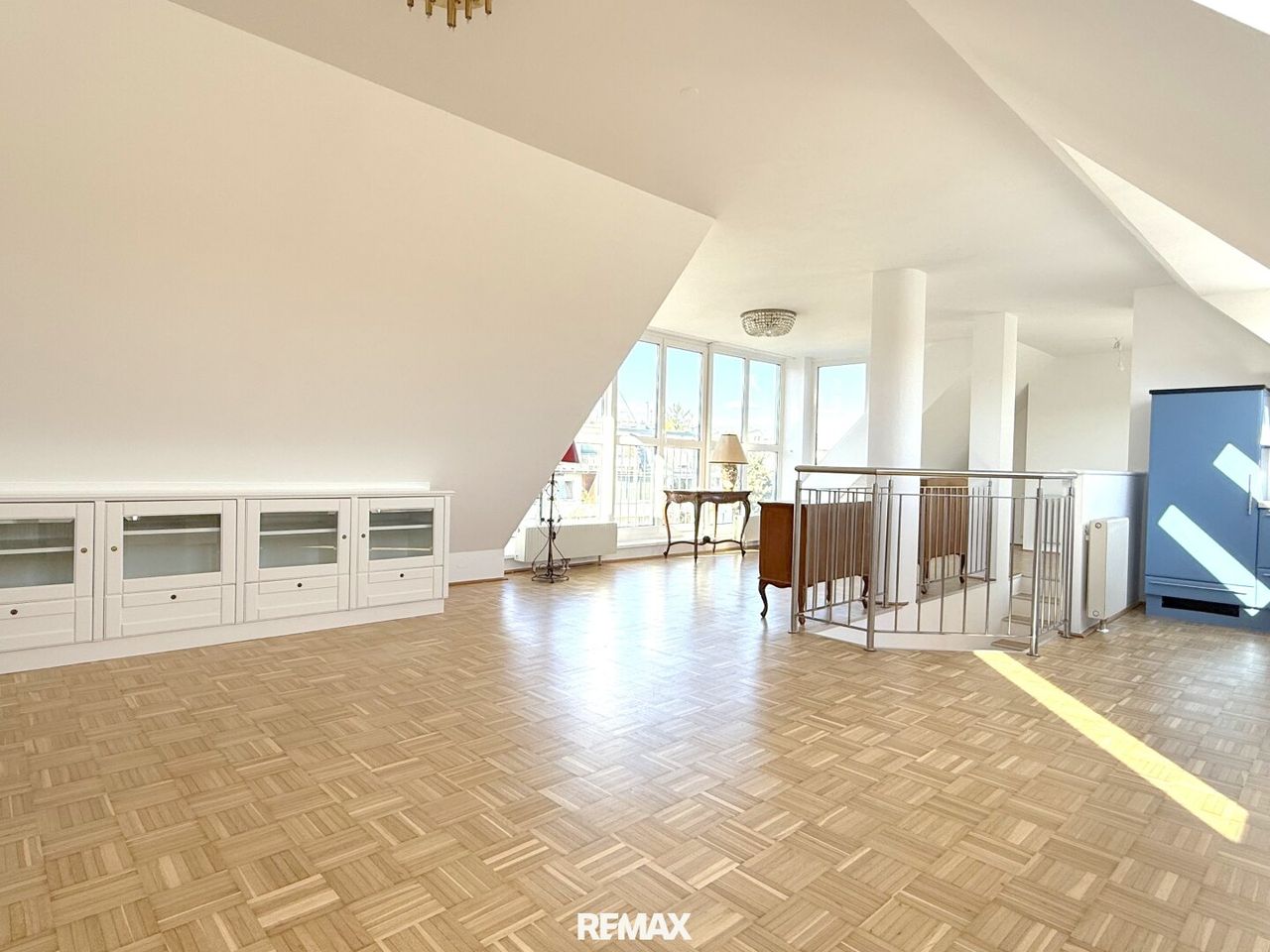 Die Treppe nach oben, jetzt ist man endgültig angekommen, sofort verändert sich die Wahrnehmung. Der Raum öffnet sich, Licht übernimmt. Keine klassische Raumaufteilung, sondern ein fließendes Konzept.