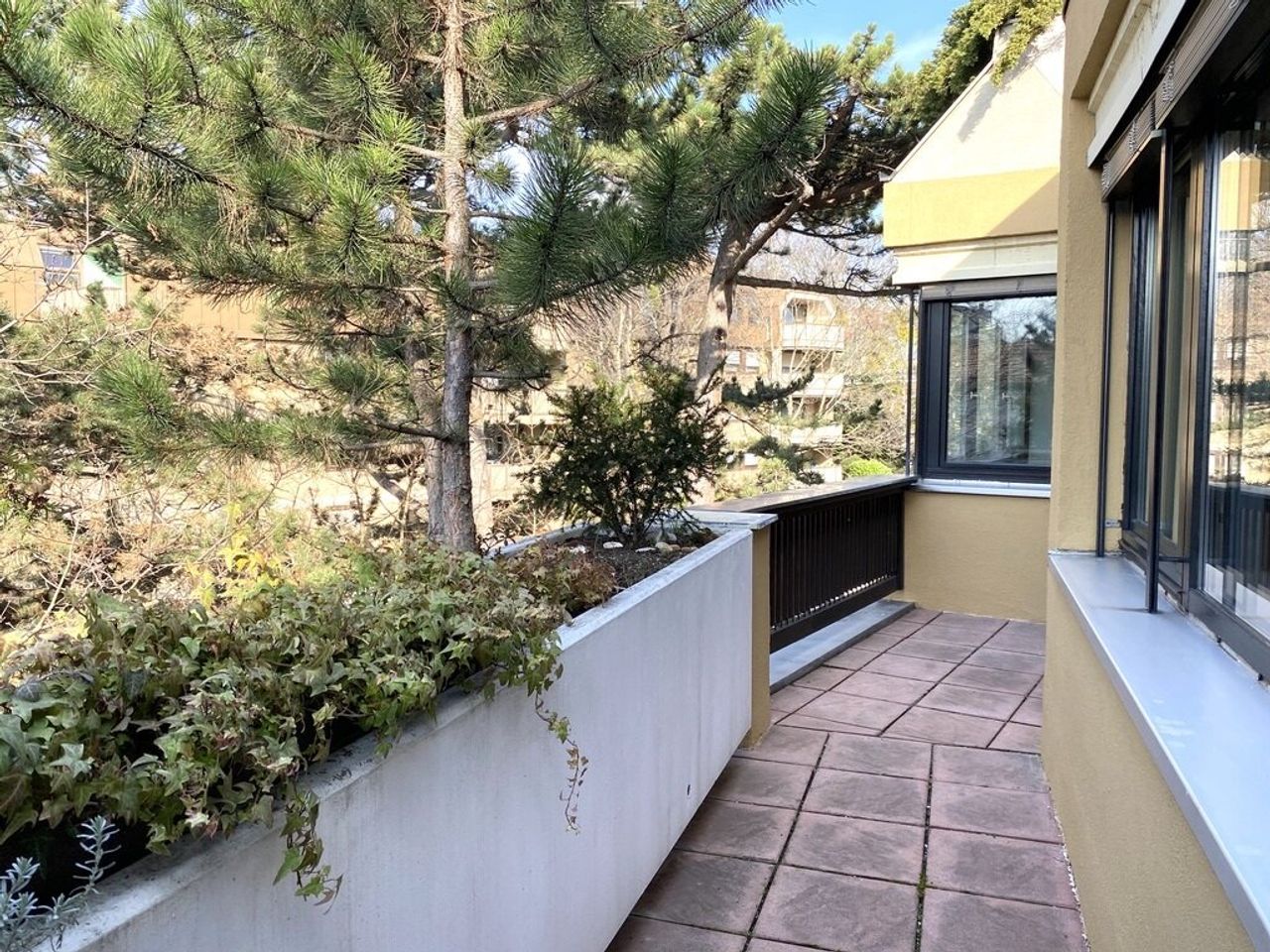 Die ruhige, großzügige Terrassenwohnung liegt im 2. Stock eines gepflegten Hauses aus dem Baujahr 1982 und wirkt aufgrund der Hanglage wie ein 4. Stock.