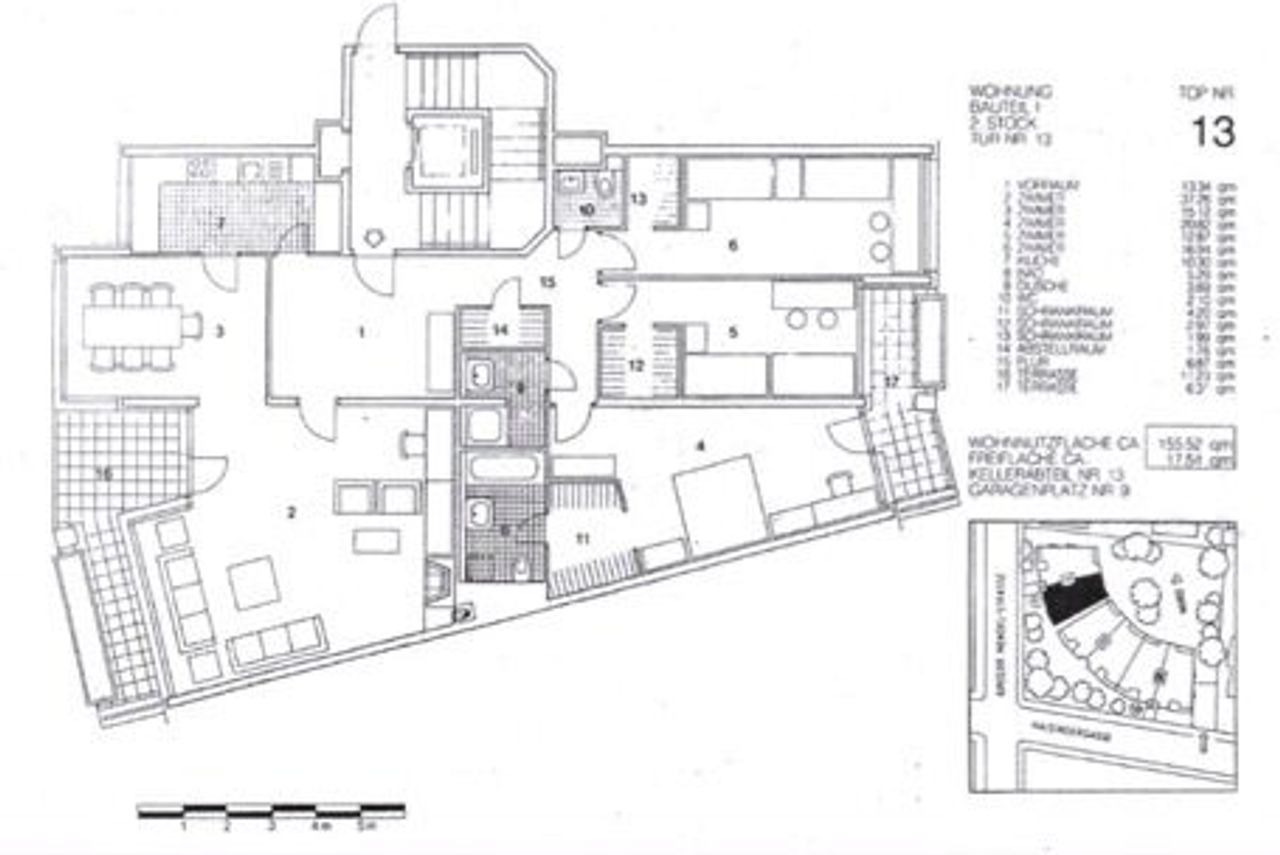 Die Wohnung verfügt über 4 Zimmer, davon ist eines ein sehr großer Wohnraum, der in einen Essbereich übergeht. Weiters gibt es eine Küche, 2 Badezimmer, 2 WC, 2 begehbare Garderoben und einen Abstellraum.