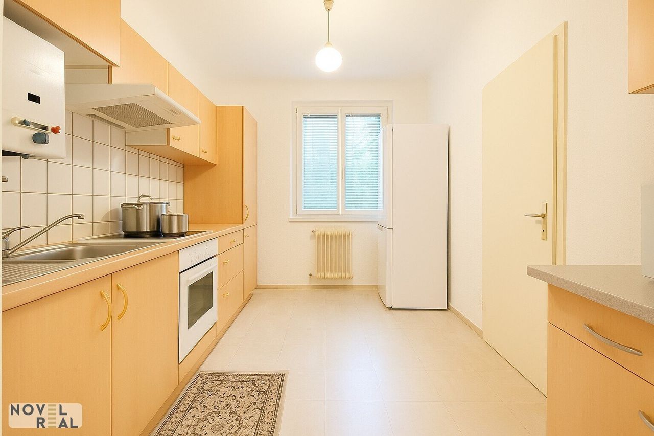 Die Küche ist mit allen Geräten ausgestattet und bietet ausreichend Platz für den täglichen Komfort. Das geräumige Schlafzimmer ist lichtdurchflutet und ruhig gelegen – ideal für erholsamen Schlaf. Das gemütliche Wohnzimmer öffnet sich zum Balkon mit grünem Ausblick und lädt zum Verweilen ein.
