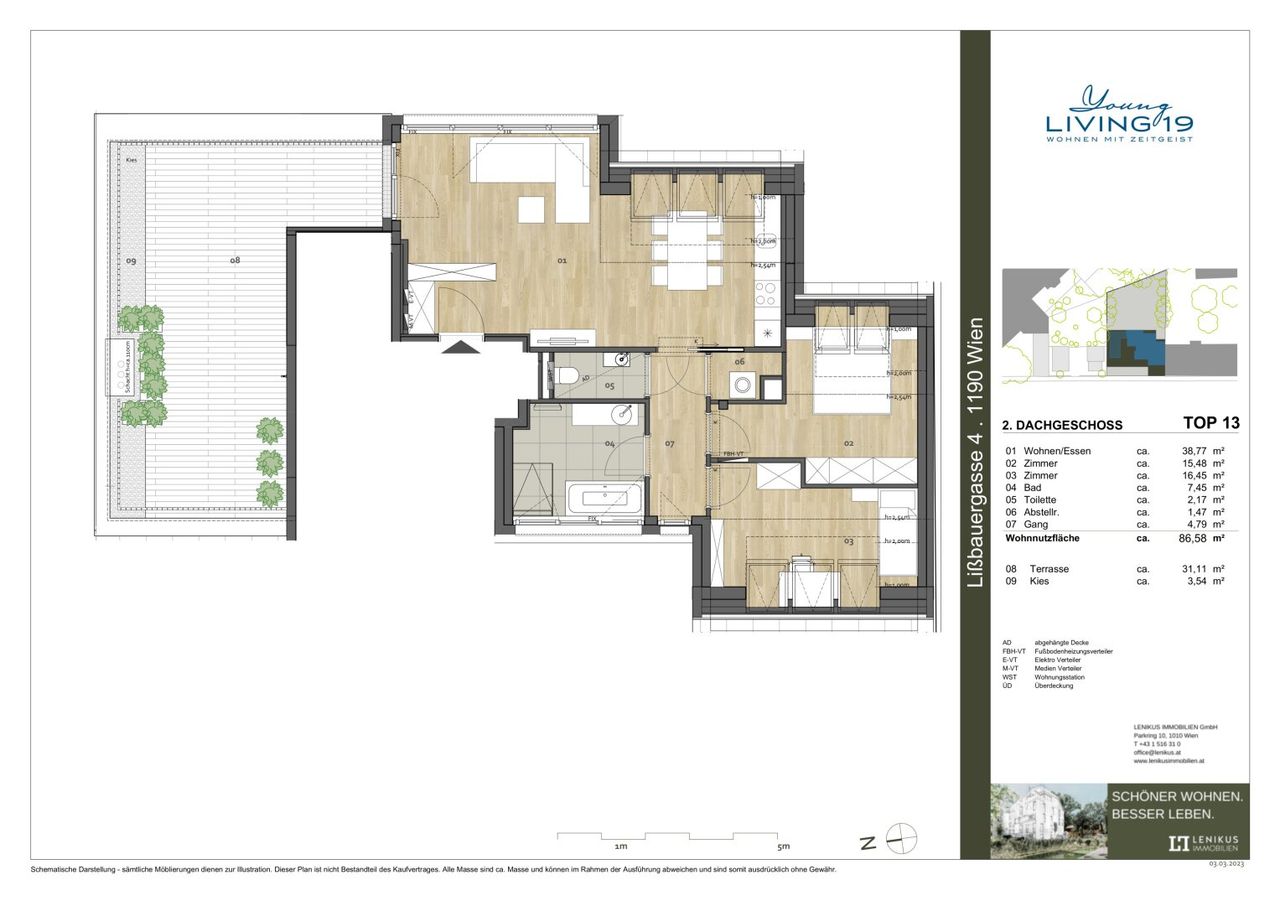 * Hochwerige Ausstattung (Echtholzparkett, bodengleiche Dusche, Waschtischverbau, Holzterrasse, etc.)
