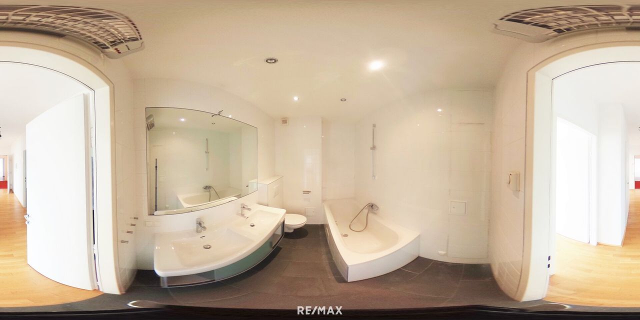 • Badezimmer mit Doppelwaschbecken, Badewanne und WC