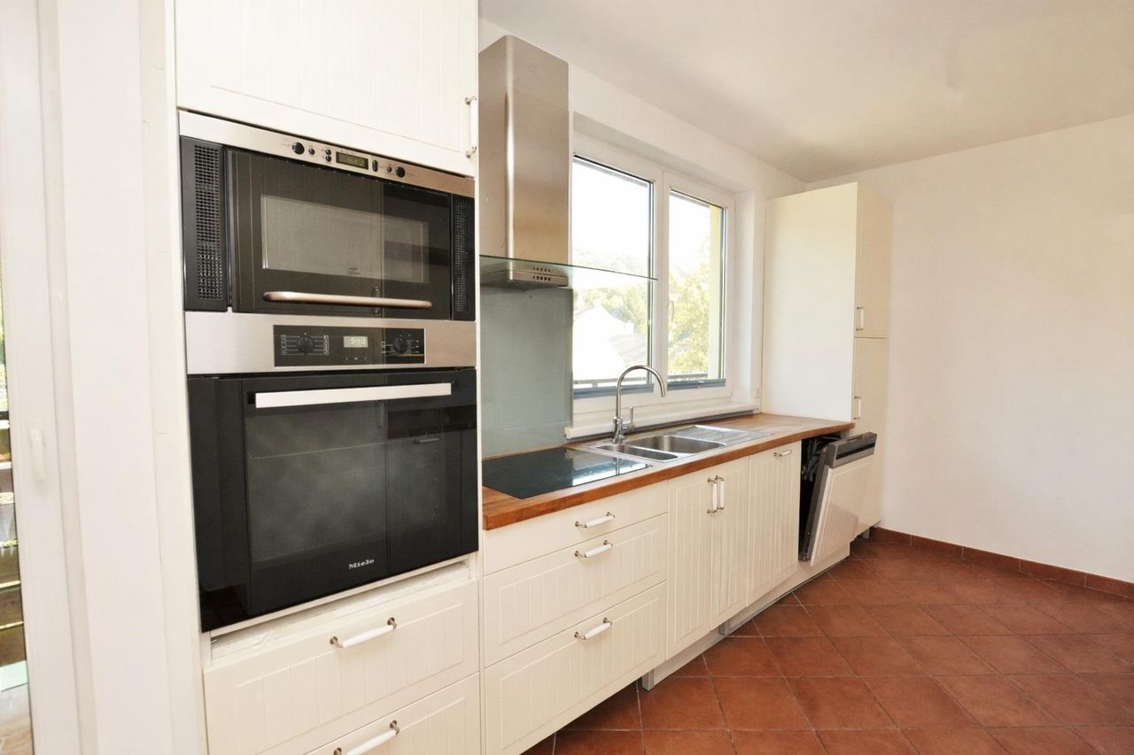 Der Küchenbereich ist separat angeordnet, die Küche ist voll ausgestattet und bietet zusätzlich Platz für einen kleinen Essbereich sowie Zugang zu einer weiteren Terrasse.