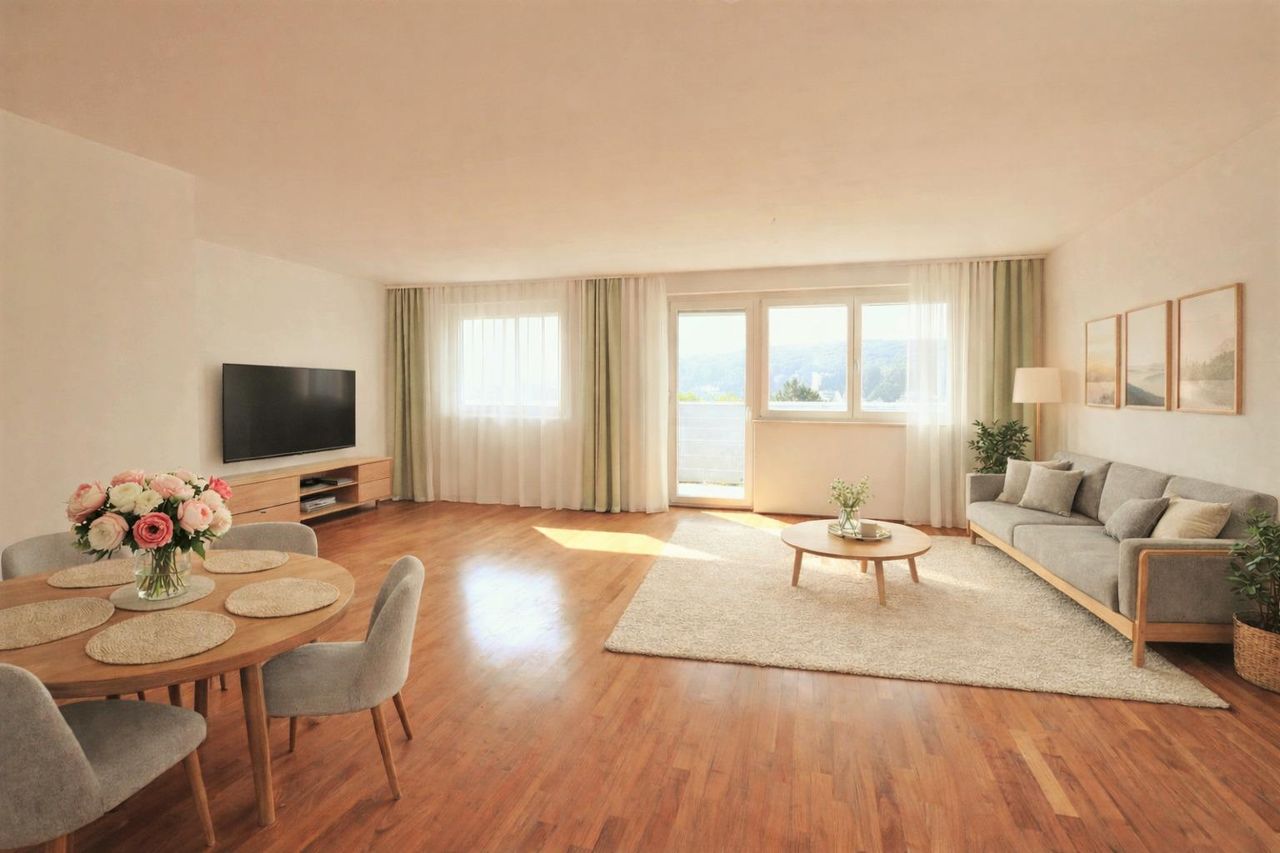 Diese gemütliche Eigentumswohnung befindet sich im 2. Stock (OHNE LIFT) in einem ca. 1961 errichtetem Wohnhaus mit nur sechs Wohneinheiten und bietet auf ca. 156 m² Wohnfläche ein großzügiges und durchdachtes Raumkonzept. Die nord-südliche Ausrichtung sorgt für eine angenehme Lichtführung, während große Fensterfronten und der Fernblick ins Grüne das Wohngefühl prägen.