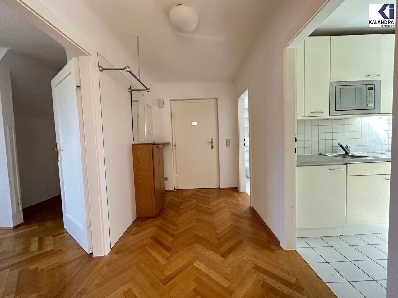zentrales Vorzimmer, Wohn-& Esszimmer (ca. 36m²) mit Ausgang auf eine gartenseitige Südterrasse (ca. 5m²), Schlafzimmer (ca. 14m²) mit anschließendem Schrankraum (ca. 3m²), modern eingerichtete Einbauküche (ca. 7m²) mit Fenster,