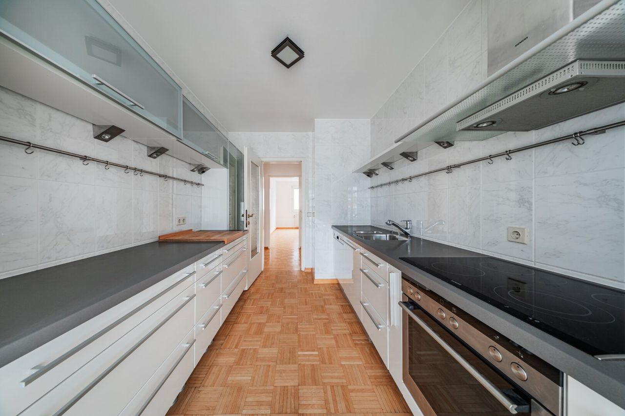 Direkt neben der Küche befindet sich eine ca. 6 m² große, vorgelagerte Loggia, die ideal Platz für einen Esstisch bietet mit schönem Weitblick.