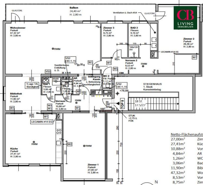 Die Räume sind mit einem geölten Natur-Eichenparkett ausgestattet. Eine WK4 Sicherheitstüre wurde neu eingebaut.