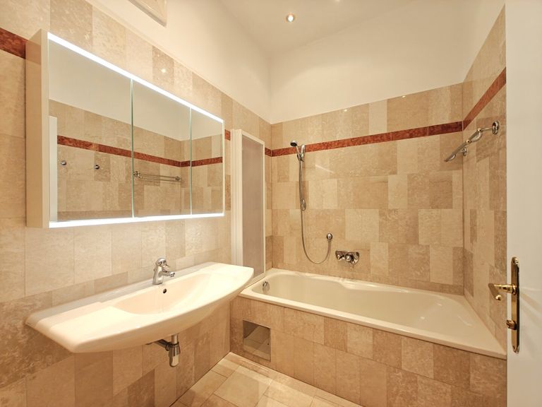 + Badezimmer mit Badewanne, Waschbecken samt Spiegelschrank und Marmorfliesen