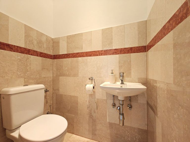 + Toilette mit Handwaschbecken und Marmorfliesen